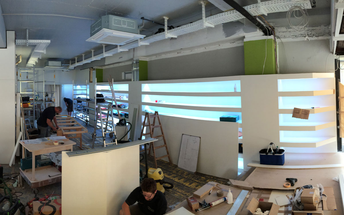 Des weiteren wird die Interaktion zwischen Personal, Käufer und Onlineshop durch die technischen Neuheiten der drei SMC-Scanstehlen und großen Displays auf ein neues Level gehoben und runden das Gesamtbild eines historisch wertvollen, ehrlichen aber zukunftweisenden Storekonzeptes ab.«