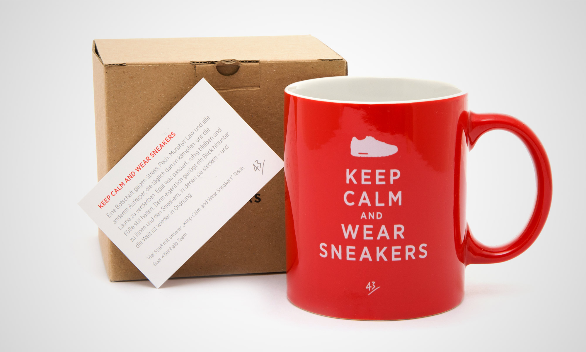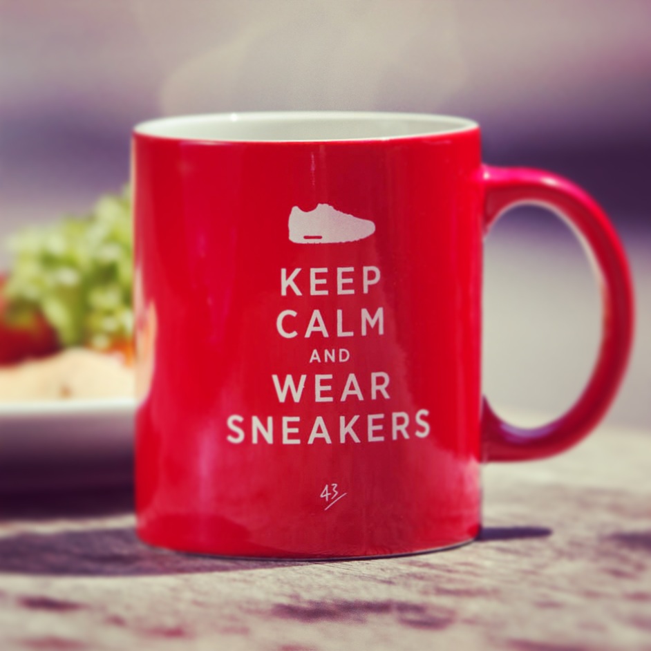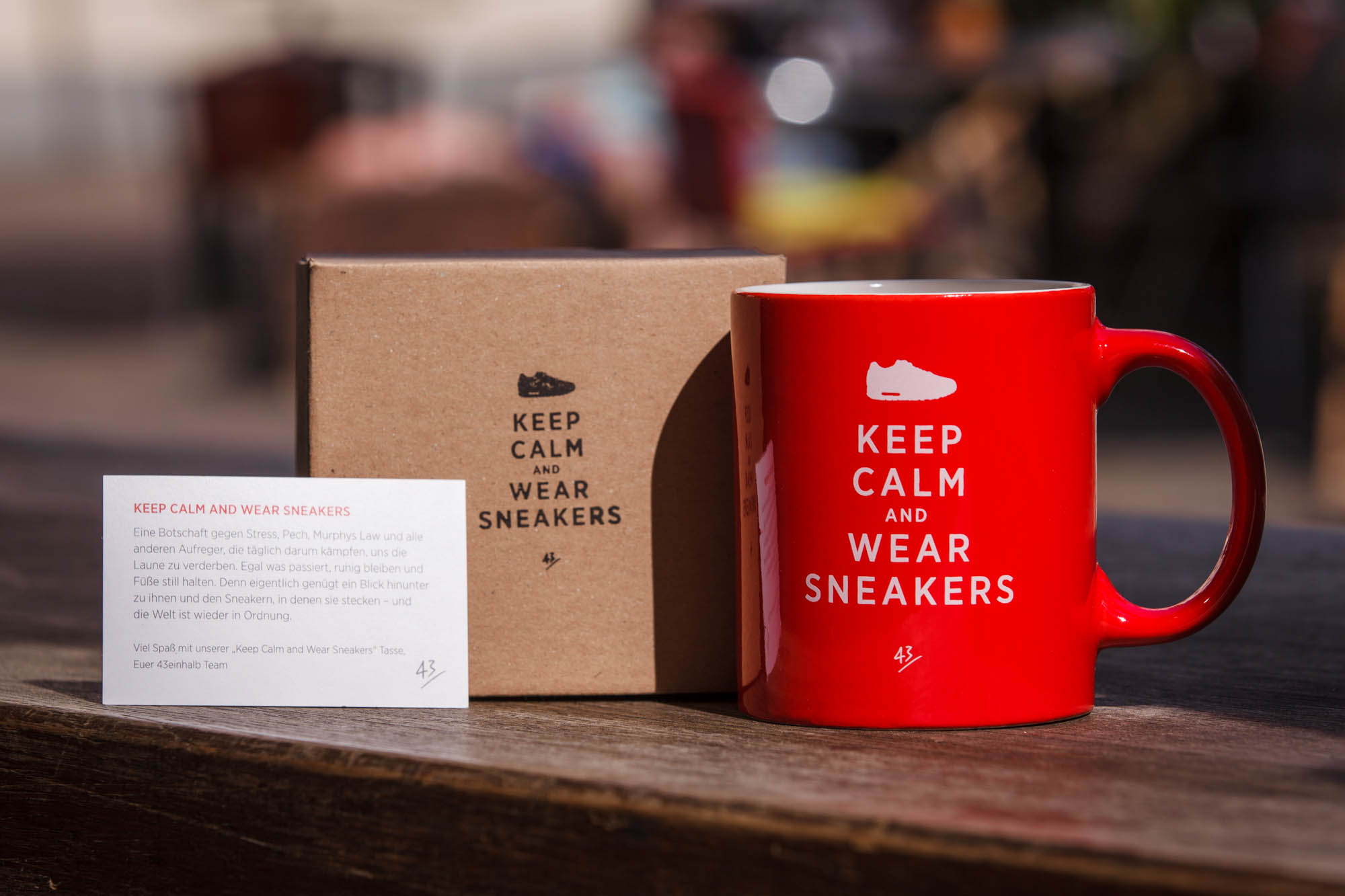 Die Idee mit der entspanntesten Sneakertasse der Republik ist Mischa schon lĂ€nger im Hirn herumgegeistert. Jetzt ist sie endlich da. Die “Keep calm and wears Sneakers” Tasse im klassischem rot der britischen Regierungsvorlage …and carry on. Keep Calm and Wear Sneakers – Eine Botschaft gegen Stress, Pech, Murphys Law und alle anderen Aufreger, die tĂ€glich darum kĂ€mpfen, uns die Laune zu verderben. Egal was passiert, ruhig bleiben und FĂŒĂe still halten. Denn eigentlich genĂŒgt ein Blick hinunter zu ihnen und den Sneakern, in denen sie stecken – und die Welt ist wieder in Ordnung.