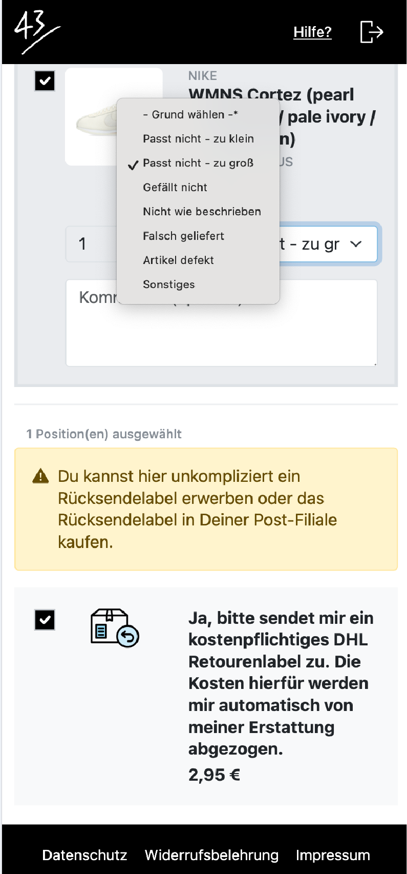 Nach erfolgreicher Suche kannst Du nun ankreuzen, welche Artikel Du zurücksenden möchtest. Wähle die Anzahl der Artikel aus und gib bitte im Dropdown den Grund für die jeweilige Rücksendung an. Nur so können wir unser Retourenmanagement erweitern und optimieren. Nun kannst Du auf den Button »RETOURE ANMELDEN« klicken.