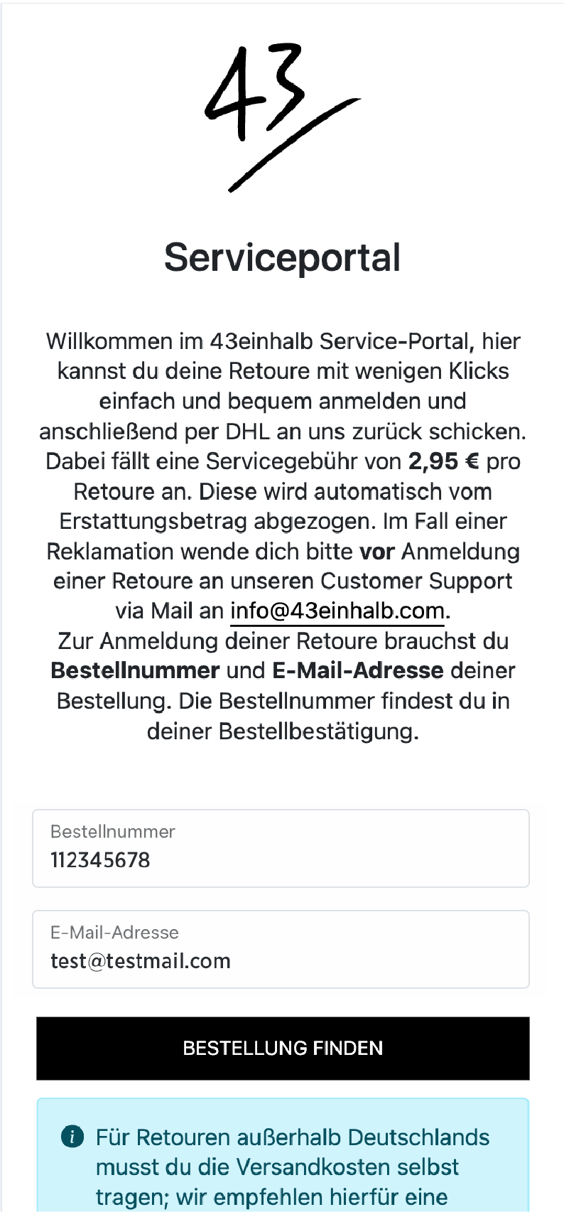 HINWEIS: Das Serviceportal funktioniert nur innerhalb der Rückgabefrist von 14 Tagen. Alle weiteren Rücksendekosten gehen zu Lasten des Käufers. Des Weiteren gilt das bereitgestellte Retourenlabel nur innerhalb Deutschlands und kann NICHT für Rücksendungen z.B. aus Österreich oder der Schweiz verwendet werden. Für alle Kunden außerhalb Deutschlands gilt weiterhin, dass sie die Rücksendekosten selbst zu tragen haben.