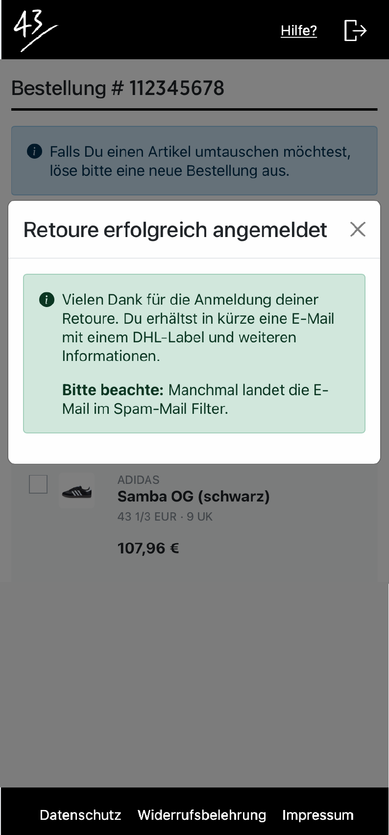 Die Retoure wurde nun erfolgreich angemeldet und du solltest in Kürze eine E-Mail mit deinem Retouren-Label und einem QR-Code erhalten. Das Retouren-Label kannst Du entweder direkt ausdrucken und auf das Paket kleben oder Du lässt es Dir mit Hilfe des QR-Codes direkt in Deinem DHL Paketshop ausdrucken. Dann nur noch das Paket abschicken und FERTIG!