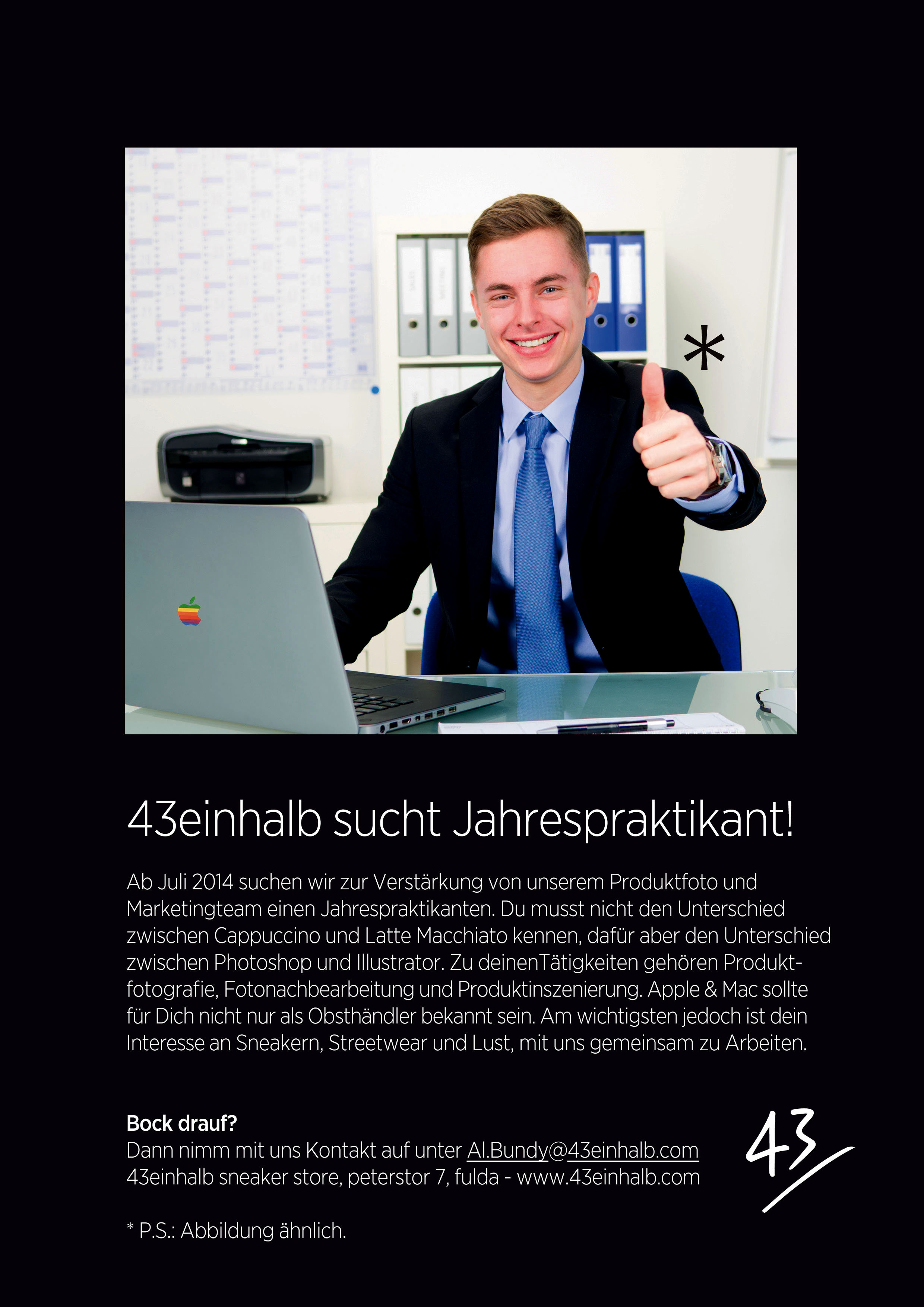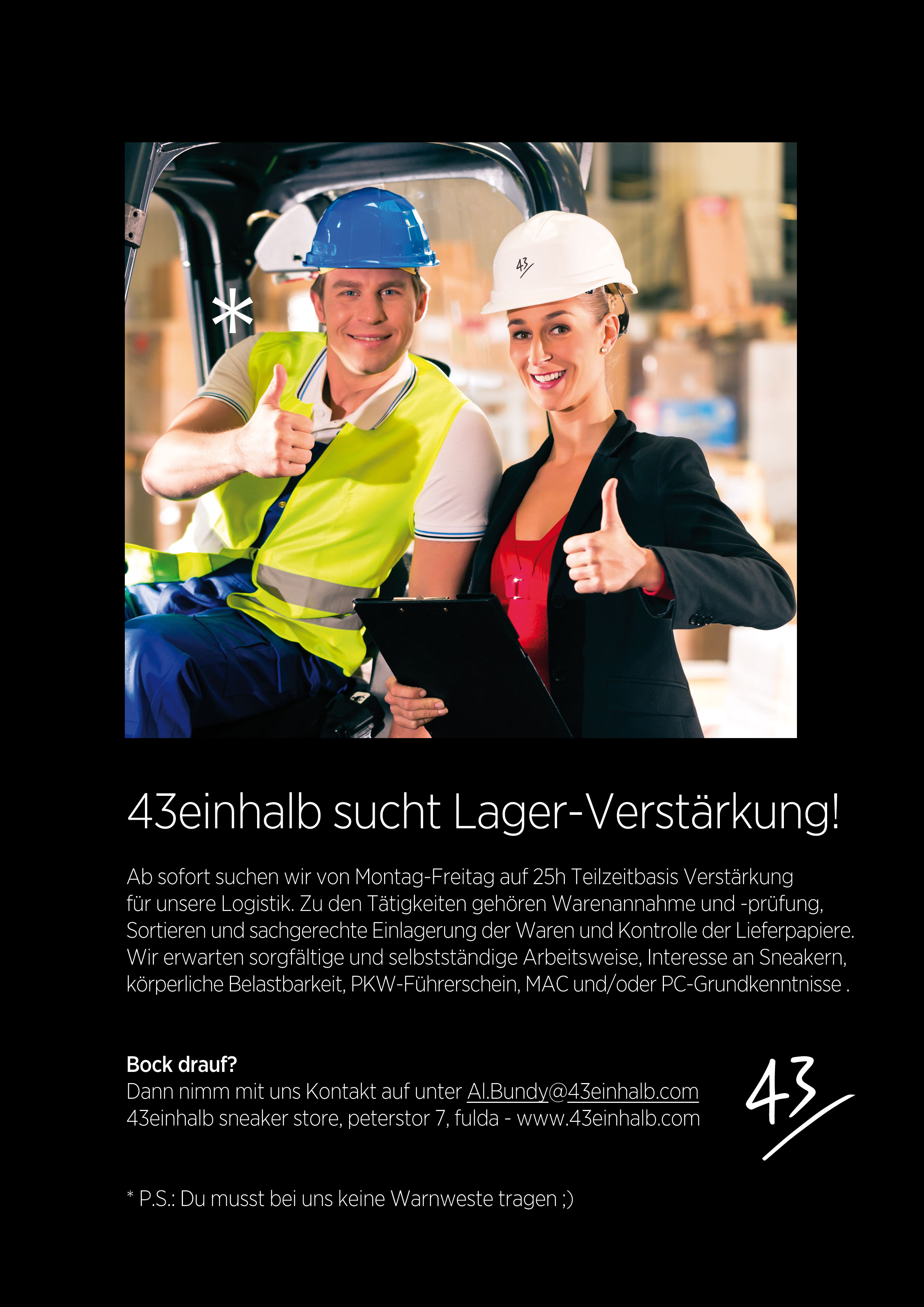 Ihr liebe Leut’ – unsere Lagerperle Christian “Perle” Perlich und unser Virtuose an der 5D a.k.a. Mario “Stumpf ist Trumpf” kommen allein nicht mehr rum. Ware einbuchen, sortieren und dann auch noch standesgemäß für euch aufhübschen benötigt eine Menge Zeit. Und schließlich will sich ja bei uns keiner das ganze Jahr buckelig arbeiten. Daher benötigen wir ab sofort Verstärkung in Perles neuem Lager und Mario ab Juli an der Marketingfront. Bitte fragt eure Freunde, Verwandten und eventuell dieses Netzwerk vom Mark, ob er nicht vielleicht einen kennt, der einen kennt. Wenn deine Empfehlung am Ende zustande kommt, belohnen wir diese als kleines Dankeschön mit einem €100,- Warengutschein von uns – Batmans Freunde sind auch Unsere! Bewerbungen bitte zu Händen Mischa per Mail an Al.Bundy@43einhalb.com oder einfach im Laden bei Roman oder Marty abgeben. Bei Fragen meldet Euch. Wir freuen uns auf Eure Einsendungen!
