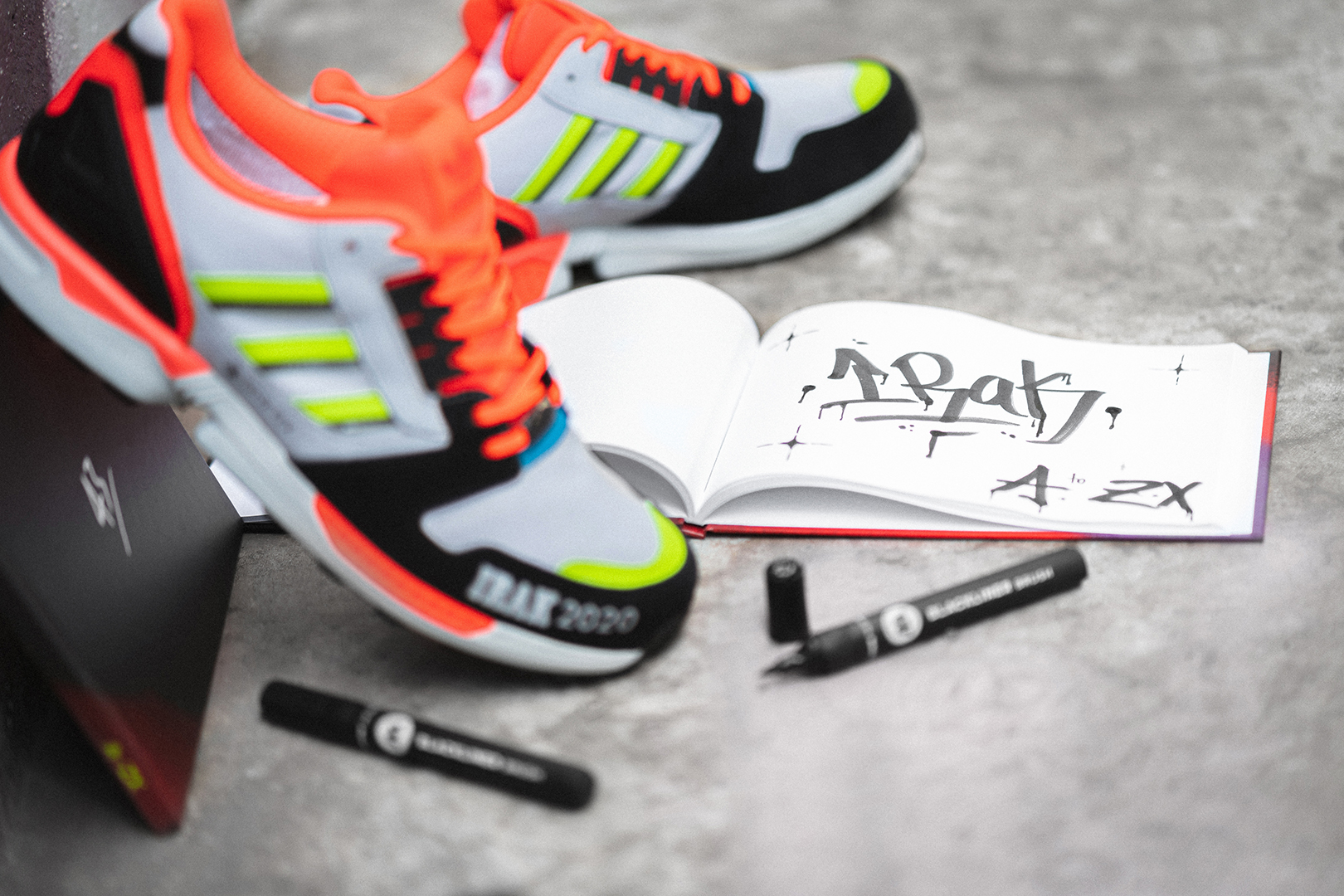 Doch das war’s noch nicht! Passend zum Graffiti-Thema dieser Kollaboration legen wir zu jedem verkauften Paar ein 43einhalb Sketch-Book und einen schwarzen Marker von Molotow gratis mit dazu.