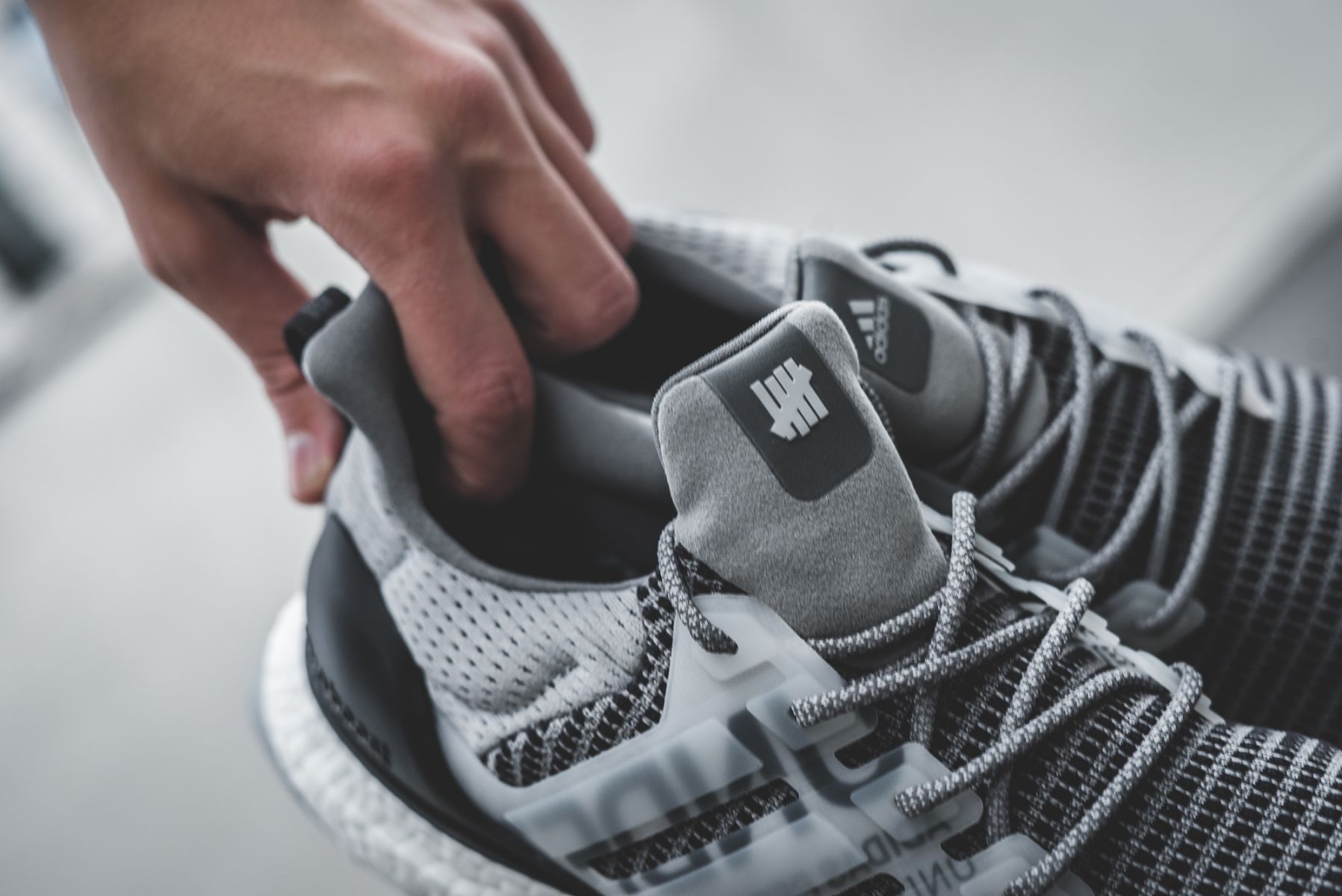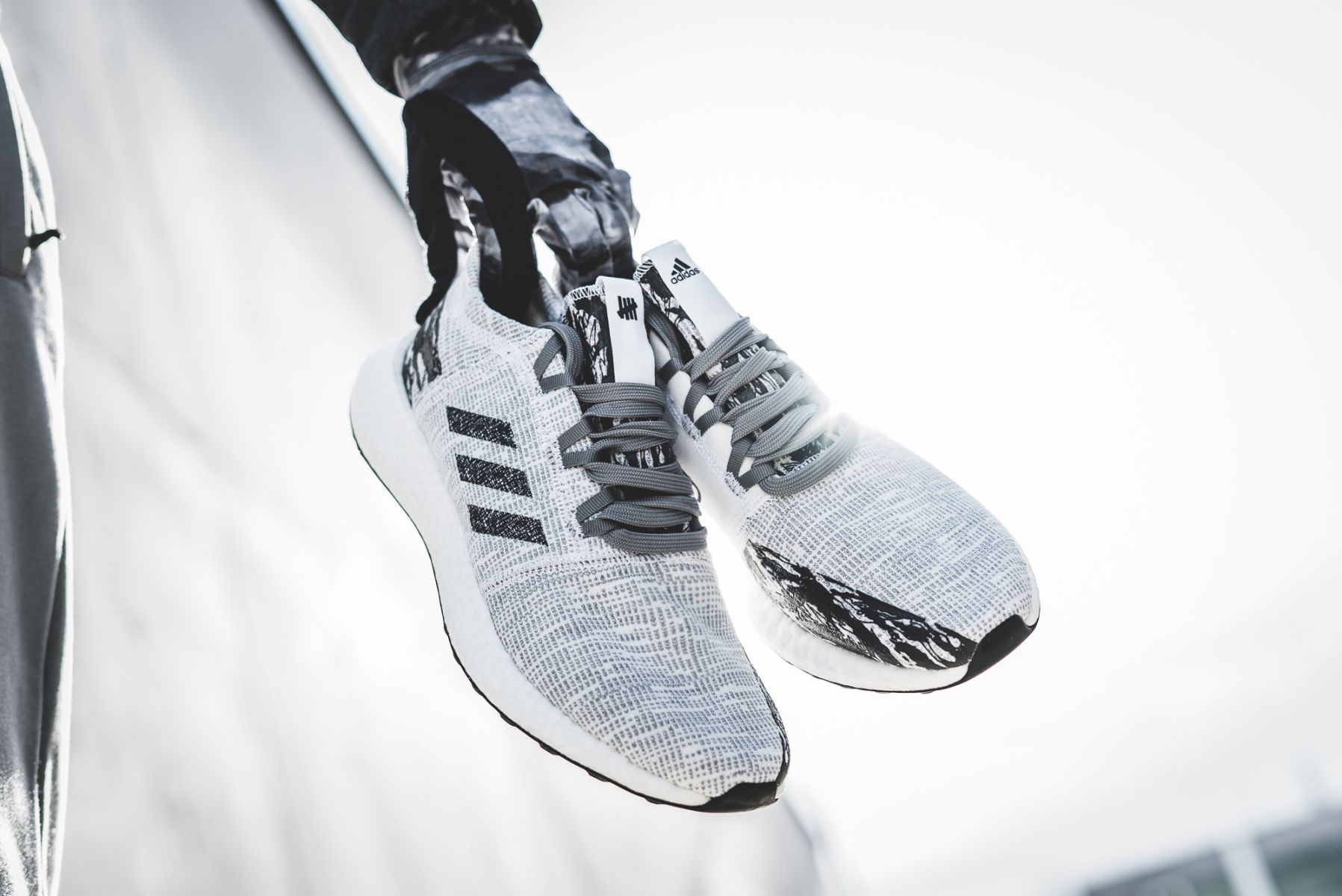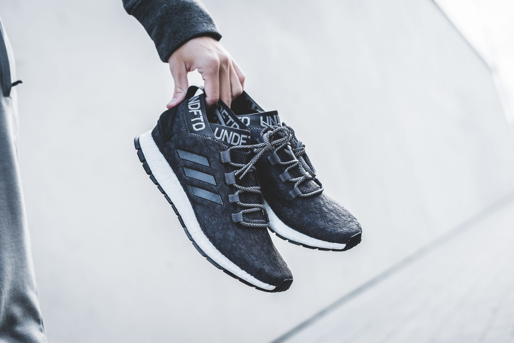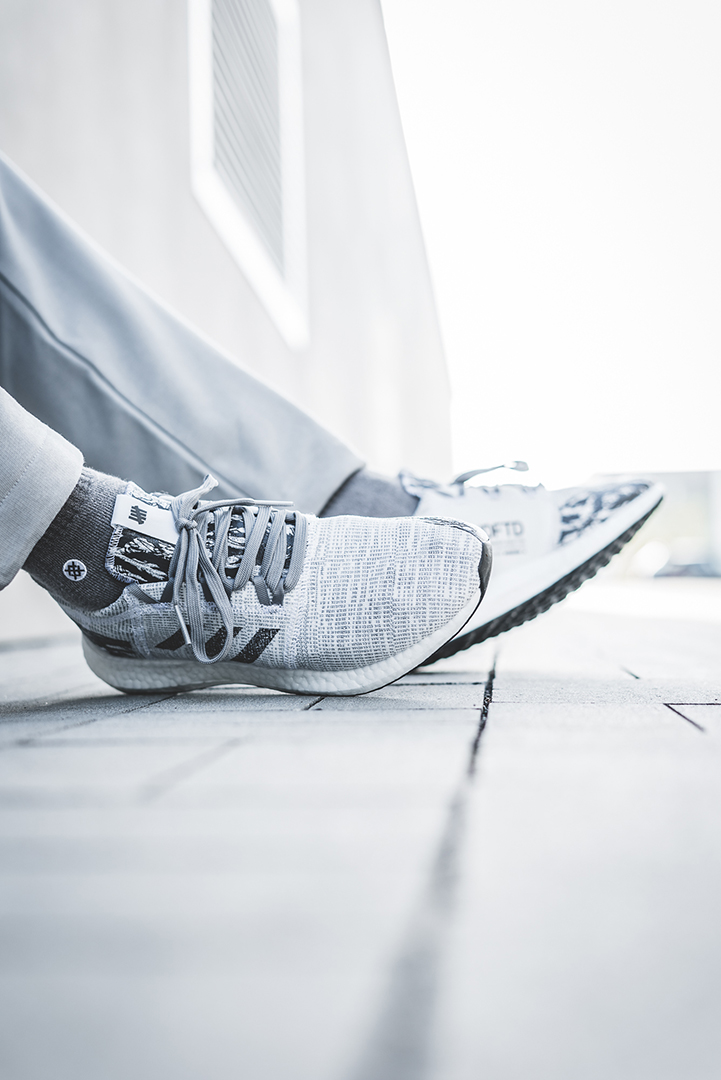 Die UNDFTD x adidas Kollektion beinhaltet diverse Apparel-Teile, inkl. Running Accessoires wie Handschuhe, Mütze und Tasche, sowie eine Reihe von Sneakern. Bei den Sneakern sind die beiden UltraBoost Colorways wohl die Key Pieces. Es wird einen schwarzen Colorway mit grauem Camouflage sowie eine graue Variante mit verschiedenen Grautönen geben. Dazu wird es je einen PureBoost LTD und RBL geben – farblich natürlich der Kollektion angepasst.