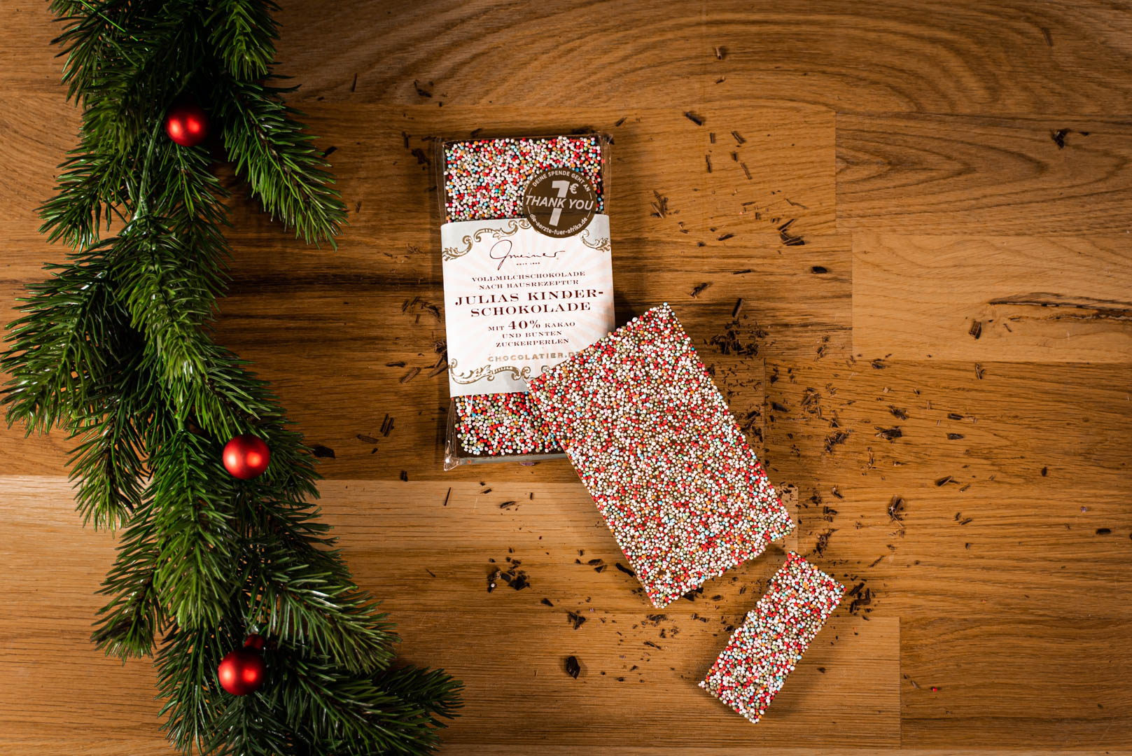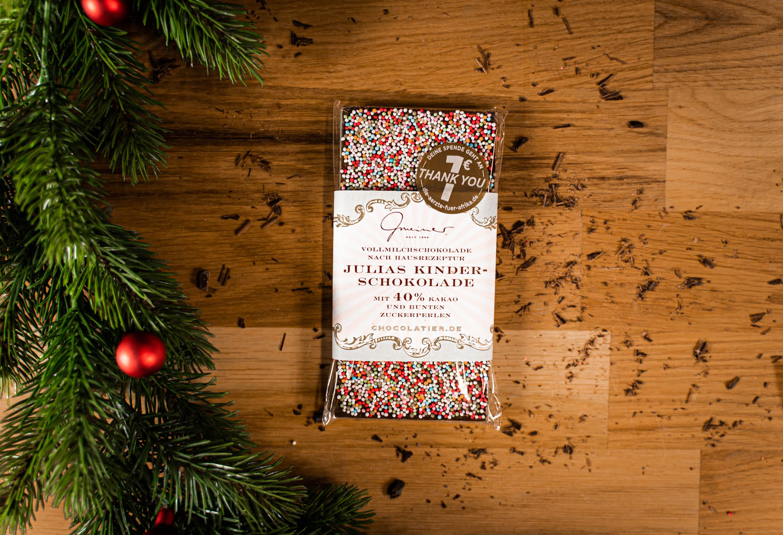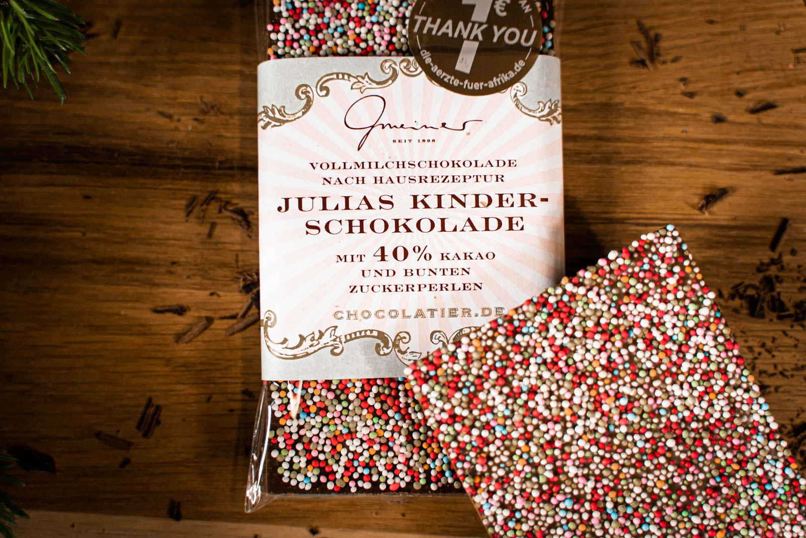 Aber genug von uns und unseren Weihnachtstraditionen. Auch wir wollen an Weihnachten nicht nur uns etwas Gutes tun, sondern auch euch und Menschen, denen es vielleicht nicht so gut geht wie uns. Ab sofort packen wir zu jeder Bestellung, die an einem Adventssonntag von euch abgeschickt wird, eine leckere Schokolade von der Confiserie Gmeiner in eure Bestellung (so lange der Vorrat reicht) und spenden zusätzlich pro Bestellung 1€ an »Die Ärzte für Afrika«. Für euch entstehen dabei natürlich keine zusätzlichen Kosten. Am 04. Advent haben wir eine Vollmilchschokolade mit vielen bunten Zuckerkügelchen für euch.