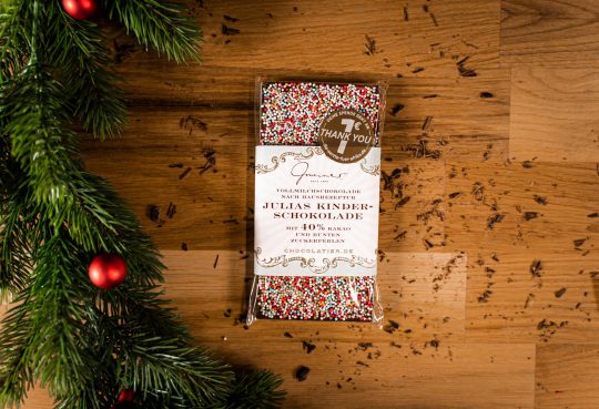 Aber genug von uns und unseren Weihnachtstraditionen. Auch wir wollen an Weihnachten nicht nur uns etwas Gutes tun, sondern auch euch und Menschen, denen es vielleicht nicht so gut geht wie uns. Ab sofort packen wir zu jeder Bestellung, die an einem Adventssonntag von euch abgeschickt wird, eine leckere Schokolade von der Confiserie Gmeiner in eure Bestellung (so lange der Vorrat reicht) und spenden zusätzlich pro Bestellung 1€ an »Die Ärzte für Afrika«. Für euch entstehen dabei natürlich keine zusätzlichen Kosten. Am 04. Advent haben wir eine Vollmilchschokolade mit vielen bunten Zuckerkügelchen für euch.