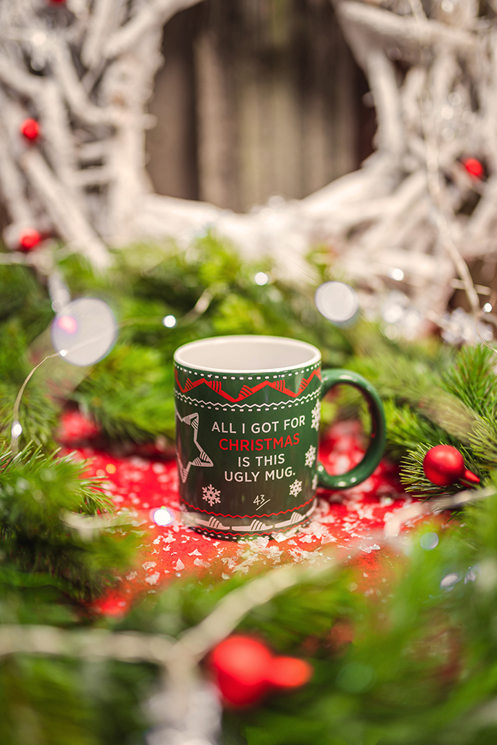 An dieser Stelle helfen wir euch mal wieder aus: Ab dem 16. November 2019 legen wir bis Weihnachten zu jedem Gutschein ab 25€ (online & instore) eine unserer fast schon traditionellen 43einhalb Mugs mit ins Paket – und diese kommt mal wieder passend zu euren »Ugly Christmas Sweatern« daher. Letztes Jahr noch in Dunkelblau, gibt’s 2019 unsere limitierte »ALL I GOT FOR CHRISTMAS IS THIS UGLY MUG« Tasse in Tannengrün mit dazu (Nur solange der Vorrat reicht)!