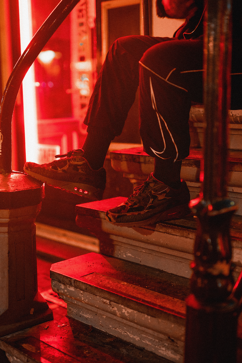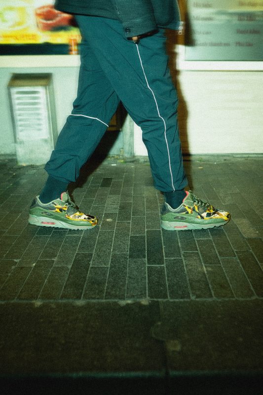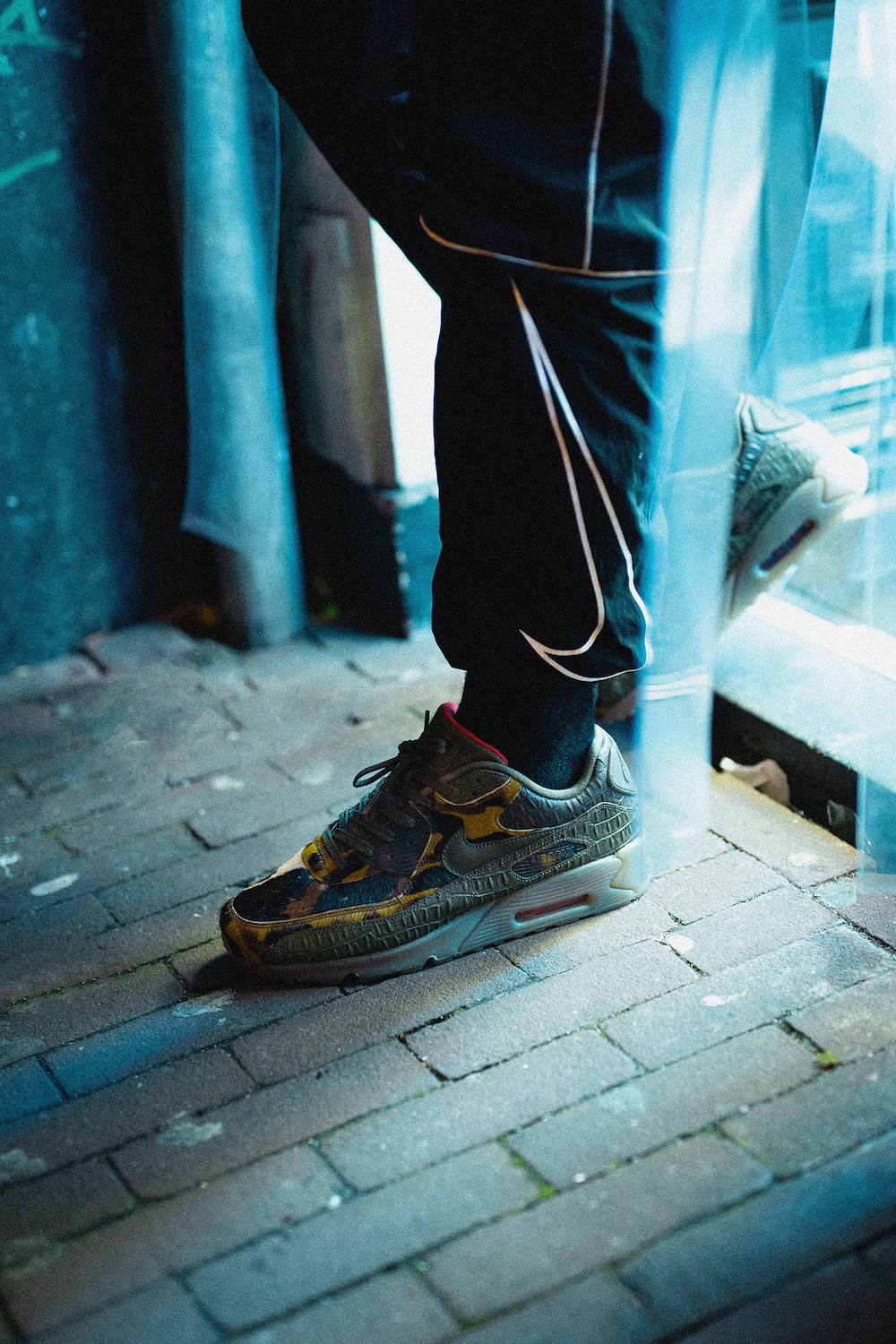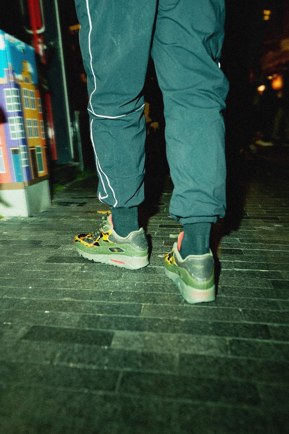 Sascha: Wir mussten ein wenig umplanen, da wir leider nur eine US13 vom Nike Air Max 90 »Go Nuts« mit nach Amsterdam nehmen konnten. Alle Vorbereitungen meinerseits waren damit hinfällig und wir hatten somit on top die Challenge, ein Model in Amsterdam mit solch einer Schuhgröße zu finden. Aus Fotografensicht ist es einfach schwierig, einen so großen Schuh ansehnlich aussehen zu lassen.