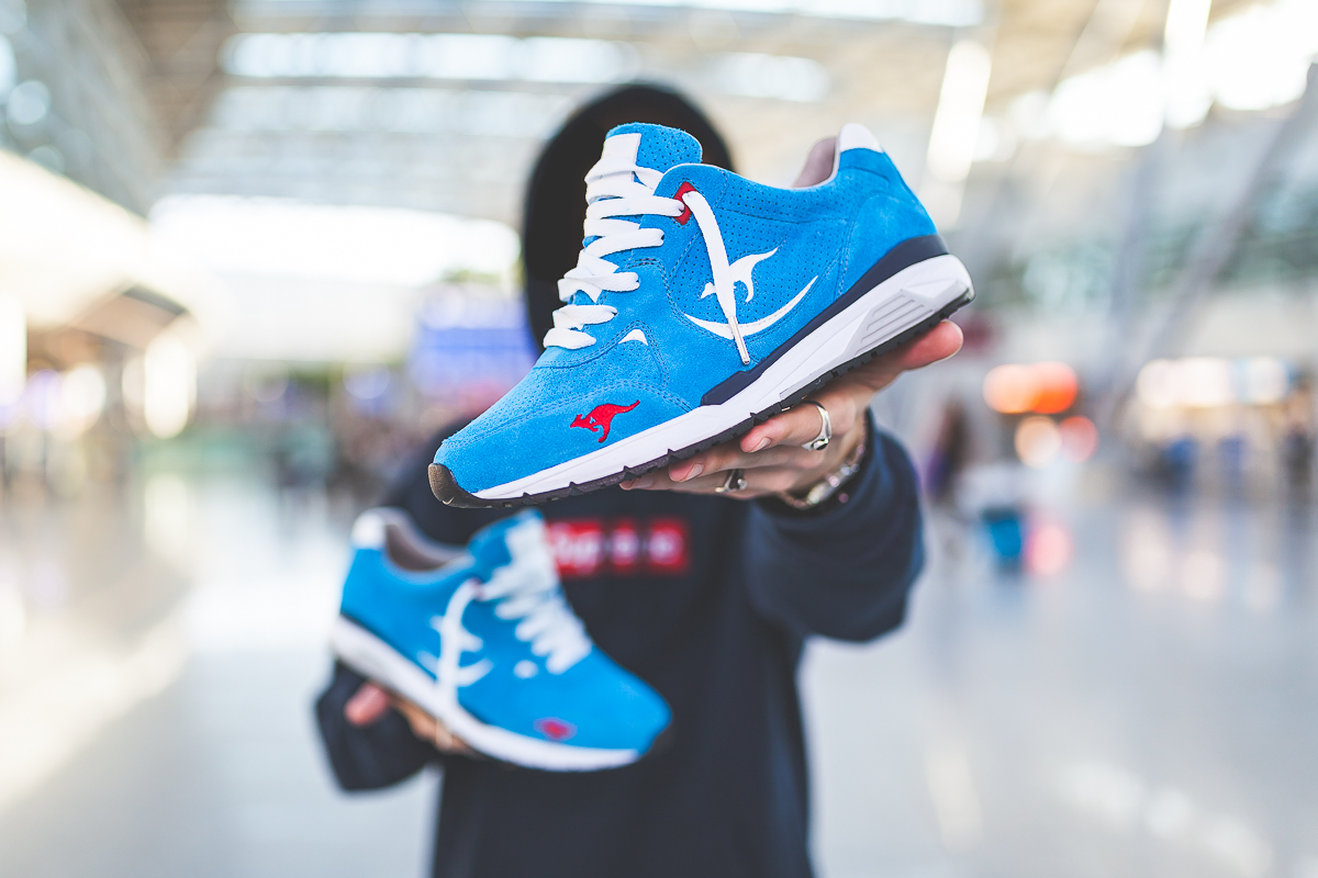 Der KangaROOS x Kwills Coil-R2 »The Flying Dutchman« kommt mit einem Mix an Premium-Materialien: Weiches, blaues Suede trifft auf perforiertes Suede, dabei vollenden weißes Glattleder und das gleichfarbige Futter aus Schweinsleder den »Flugzeug«-Look. Rote und weiße Details wie der »Mini ROOS« sorgen für schöne Highlights. Besonders gut gefällt uns die gebrandete Innensohle.