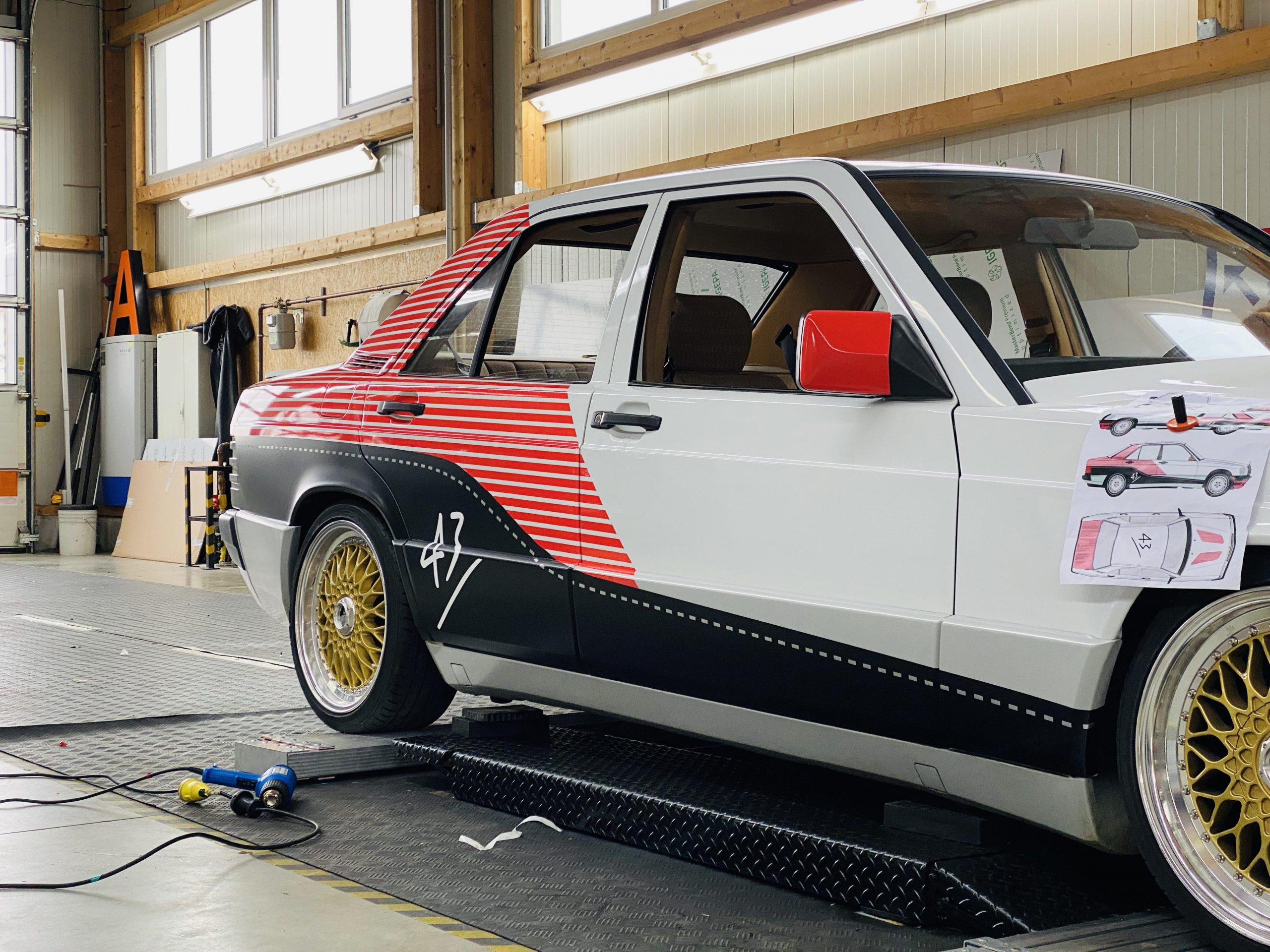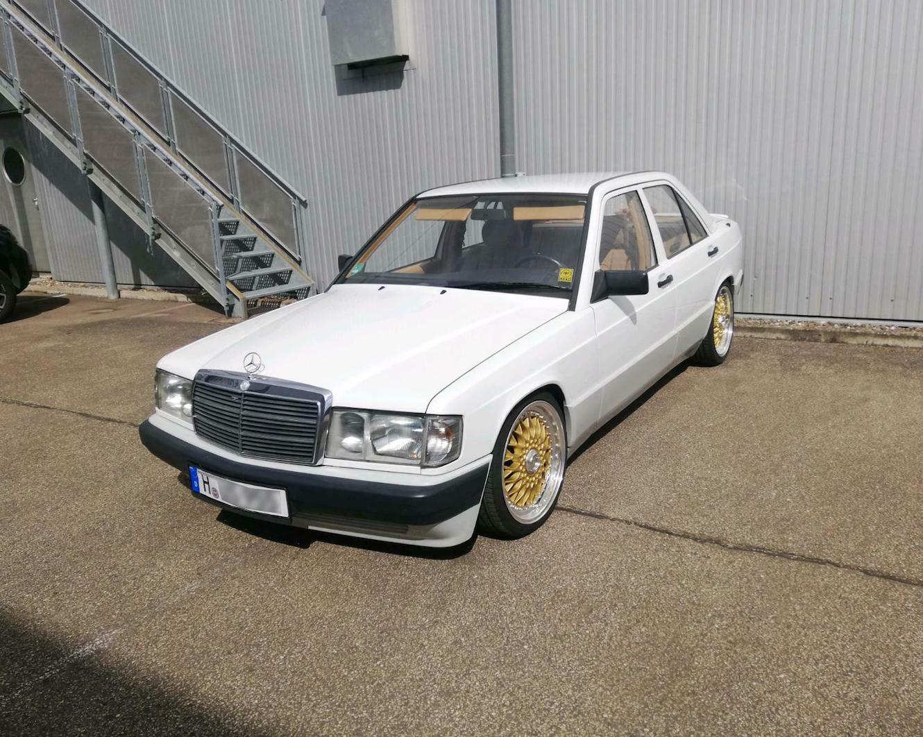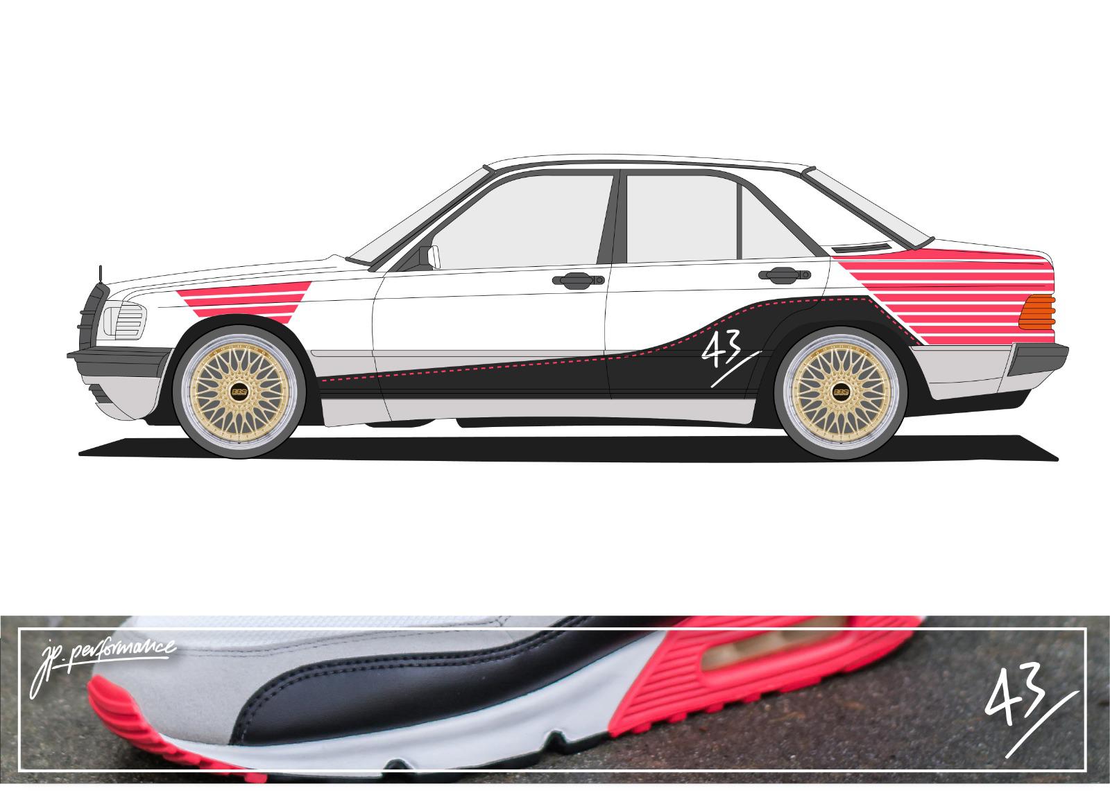 Als wir dann wussten, Savas und seine Crew sind dabei, ging es parallel an die Fahrzeugsuche – und was gäbe es Passenderes zu einem Air Max aus 1990 als ein Benz 190 aus dem Jahr 1990? Hier hat sich unser »Benzinkopf« Robert dahinter geklemmt und das Internet auf Links gedreht. Die Vorgabe war schwierig, da relativ selten: Außen komplett Weiß, top Zustand, »Stance Optik«, innen möglichst hell und ausschließlich mit dem Baujahr 1990. Nach wochenlanger Recherche und unzähligen Telefonaten wurden wir südlich von Hannover fündig. Ein komplett restaurierter 1.8E W201 mit der seltenen hellbraunen Stoff-Innenausstattung »Dattel«. Gesehen, Geprüft, Gekauft! Danach wurde das Auto von Robert und Tjorm zurück nach Fulda geschafft zum weiteren Prozess.