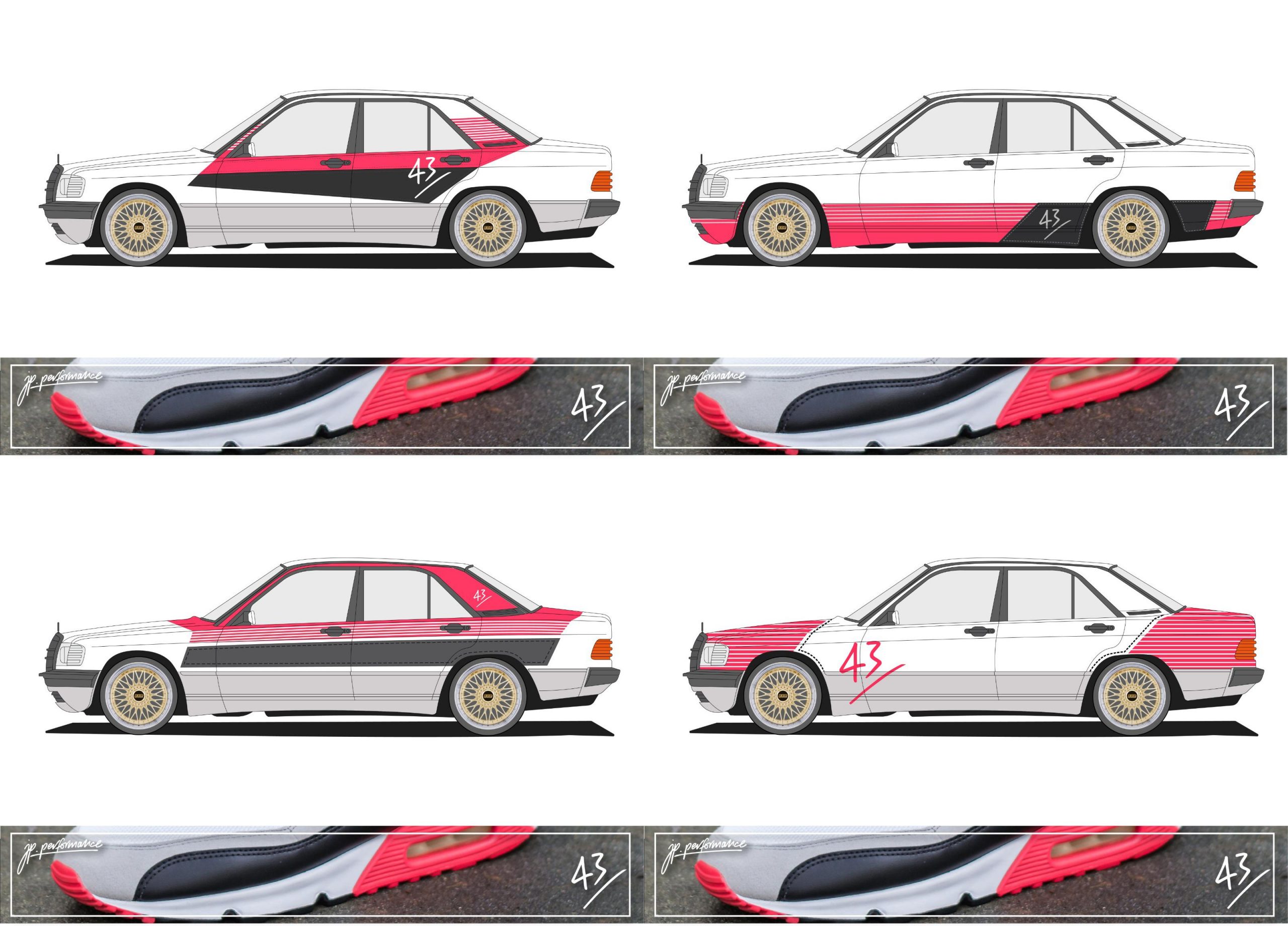Den JP Jungs war es wichtig, nicht durch ein komplettes Wrapping des Fahrzeugs den zeitgenössischen Charakter zu verändern, sondern auf die Originalform des »Baby Benz« die Designdetails des »Infrareds« zu übertragen. Das ist ihnen definitiv gelungen! Mudguard plus Stitches finden sich auf den Sakkobrettern wieder, die »Rallye Streifen« des Airpads auf em Heck und die Hutzen auf der Hauben haben die gleiche Form wie die seitliche Niere des Air Max III. Mit dem Support der Jungs von SCHREIBER und Inhaber Michael aus Fulda konnten wir noch in einer Nachtschicht den exakten »Radiant Red« bzw. »Red Coral« Farbton vom Rot treffen.