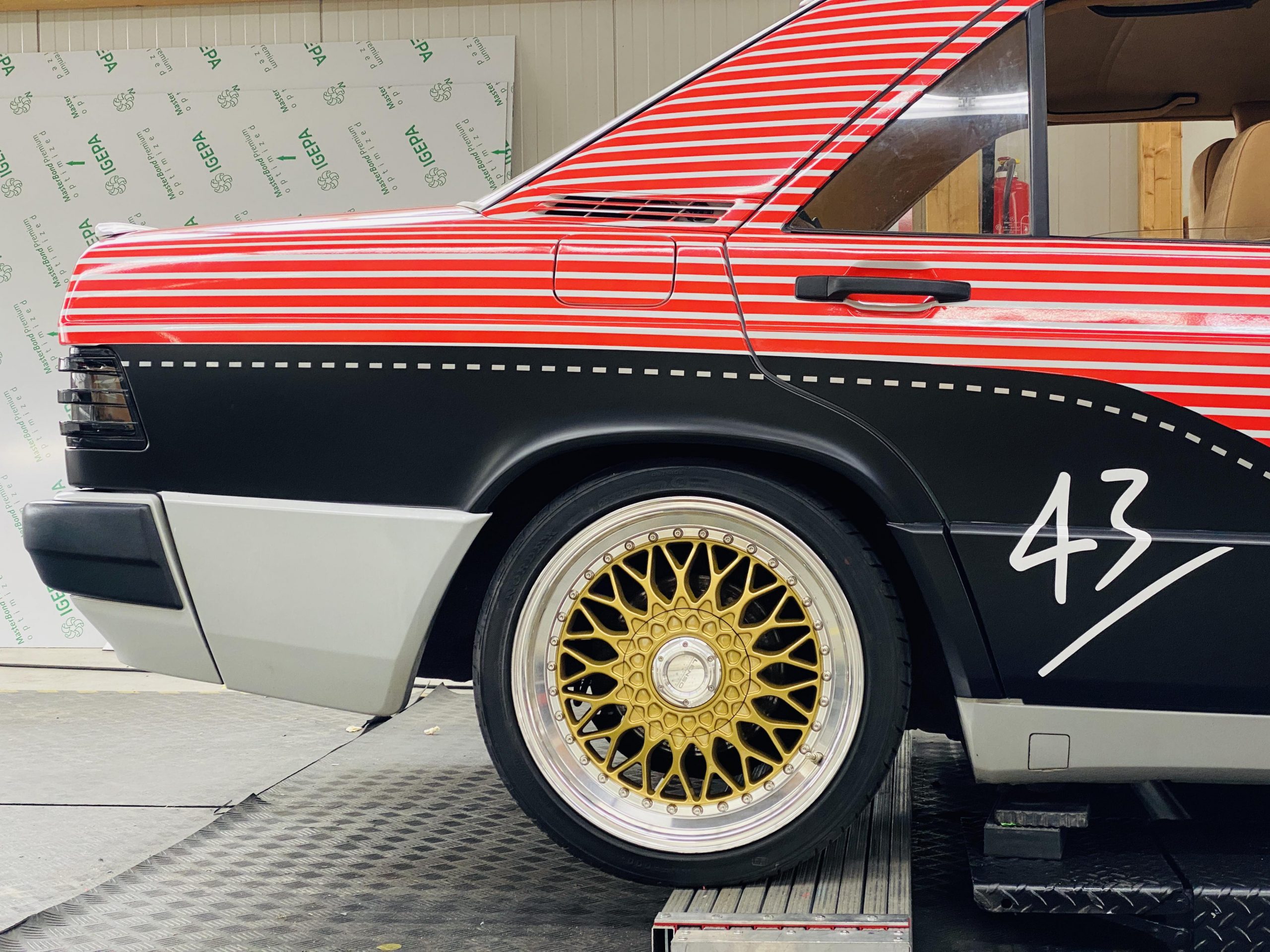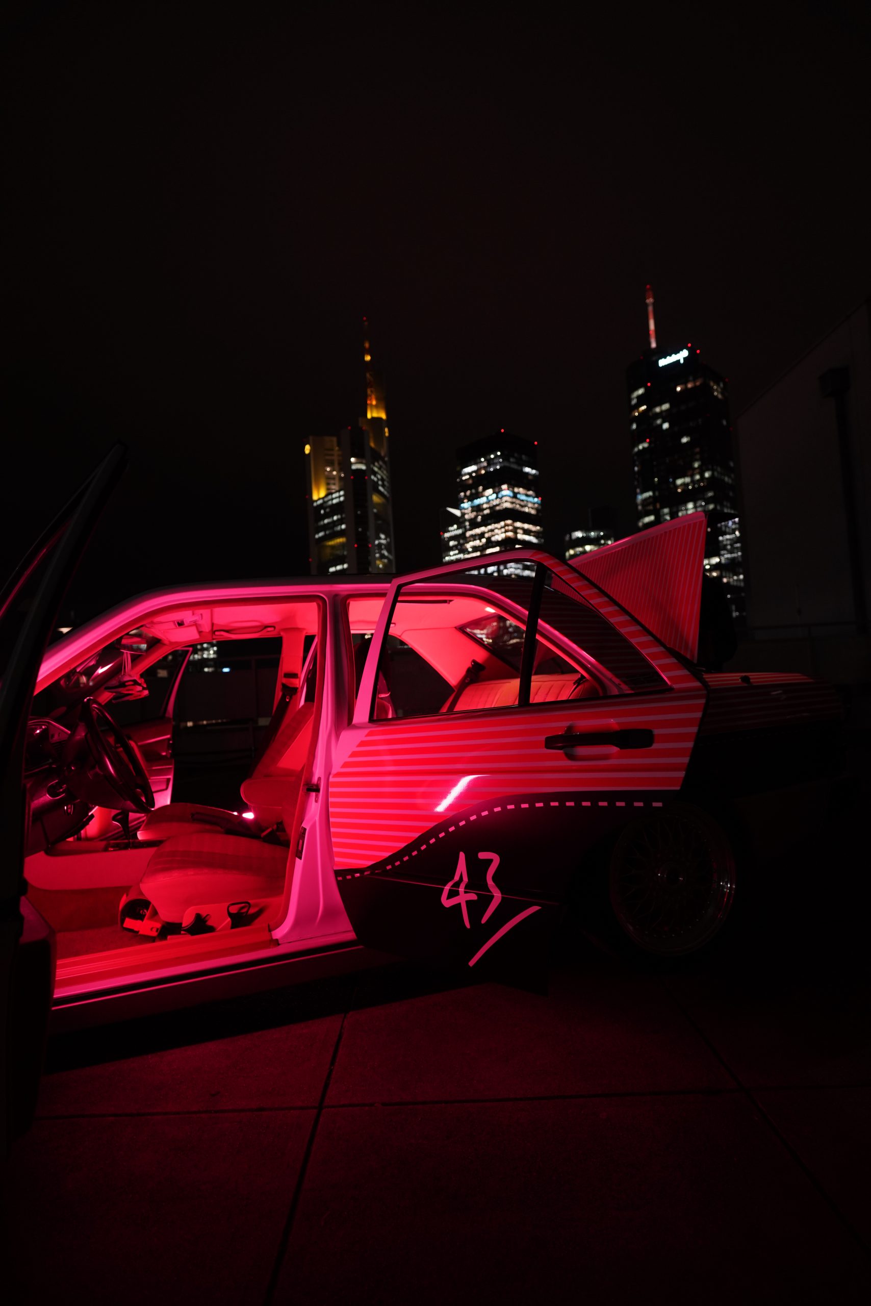Zusätzlich wurden die Kopfstützen (Danke Ute!), Handschuhfach und die Nabenkappen individualisiert, das alte Alpine »Mäusekino«-Radio gegen ein Original BECKER Avus getauscht und das Fahrzeug innen und außen komplett aufbereitet. Wie es sich gehört wurden die letzten Details noch 15 Minuten vor Shootingbeginn in Frankfurt/Main fertiggestellt.