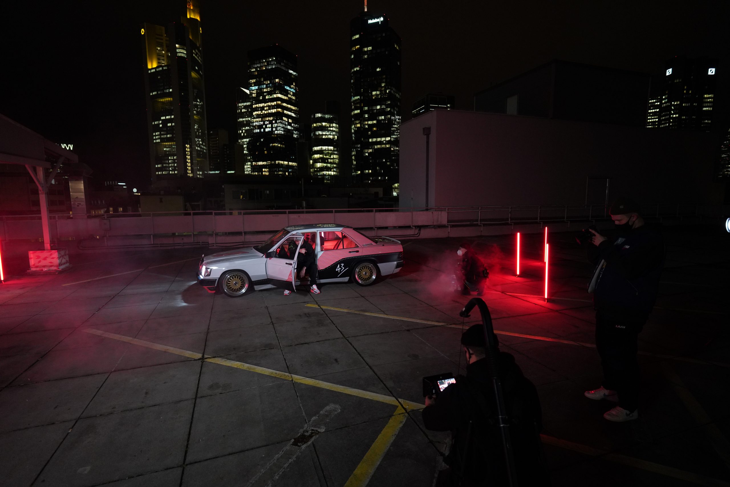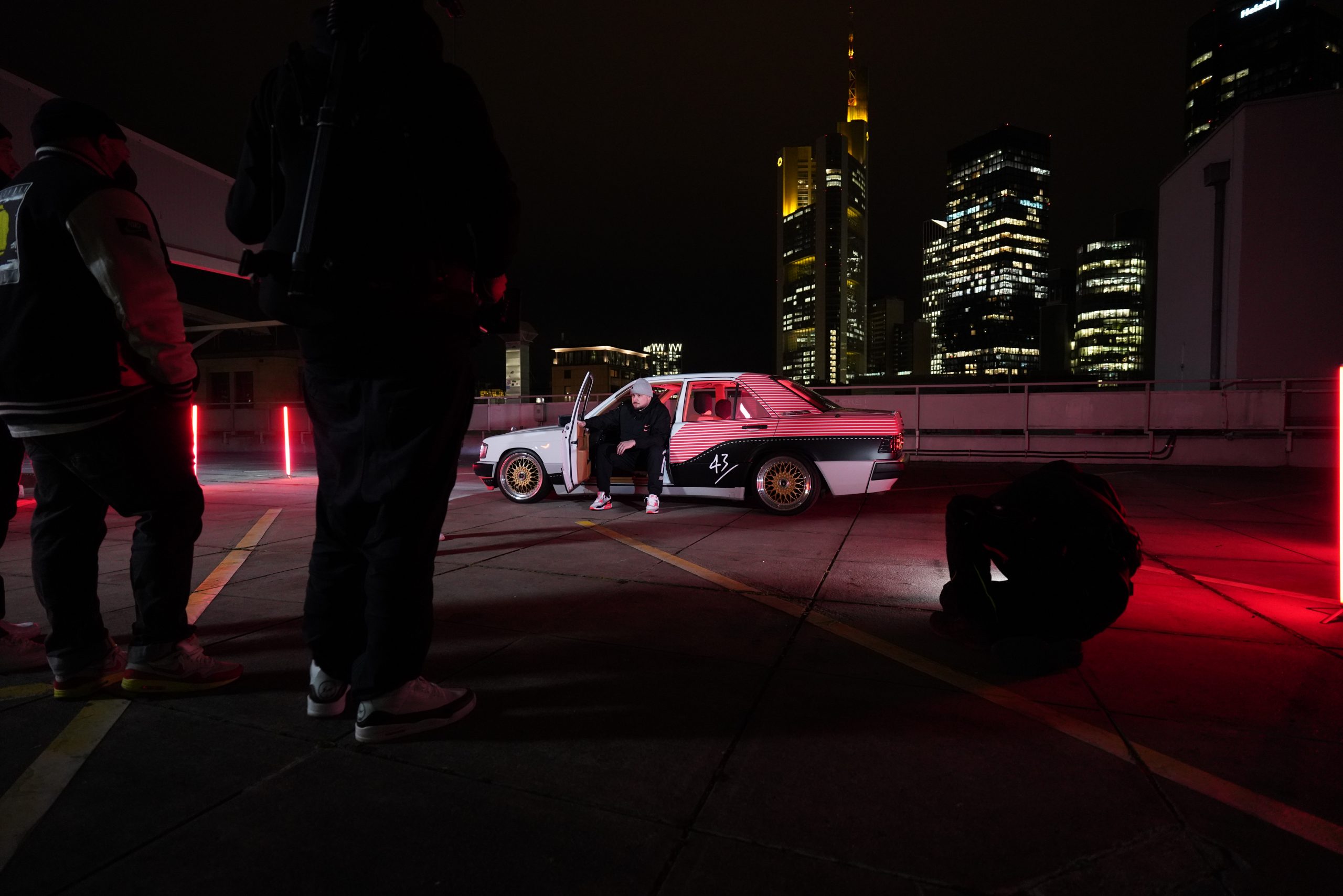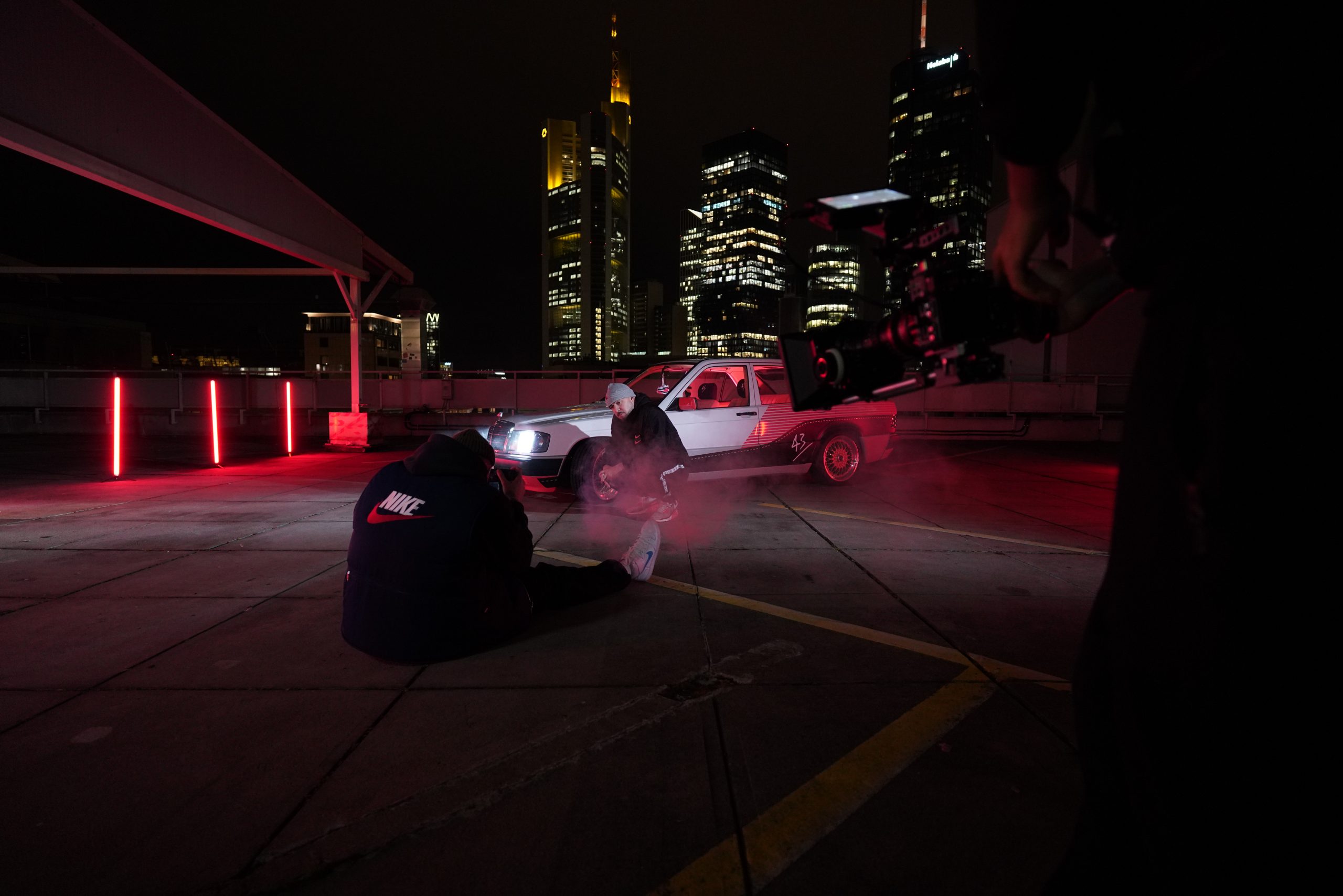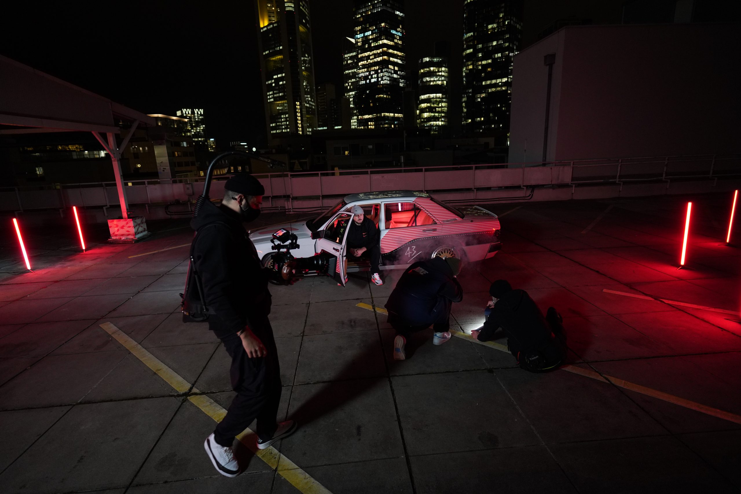 Der Benser lief auf eigener Achse nach »Mainhattan« und die erste Shootinglocation war das Dache des Börsenparkhauses mit Blick auf die Frankfurter Skyline. Mario und Sascha brachten ihre Jungs von photon (Licht) und Martin (Drohne) für die Produktion mit. Nach einem kurzem Outfitcheck im 43einhalb Store mit der KKS-Crew ging es um 17 Uhr dann an der ersten Location im Dunklen los.