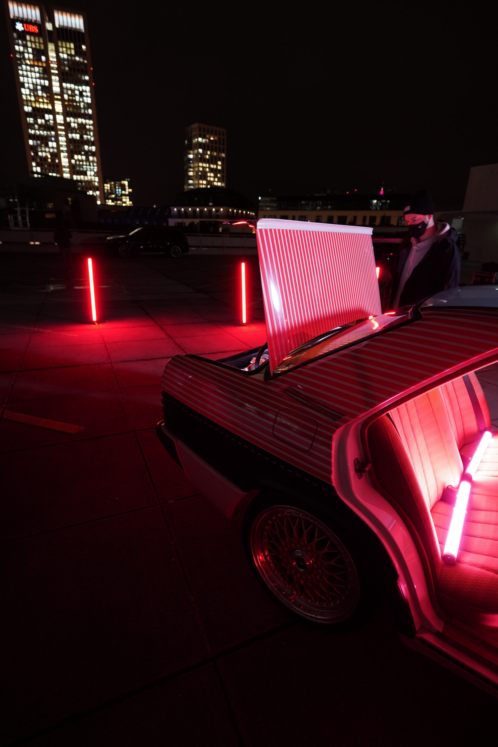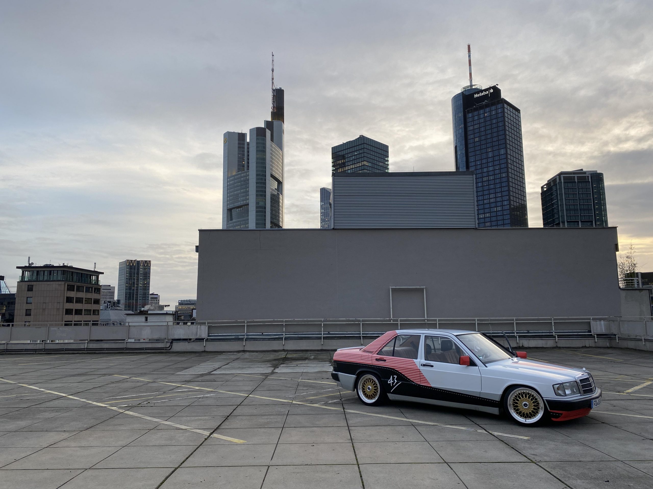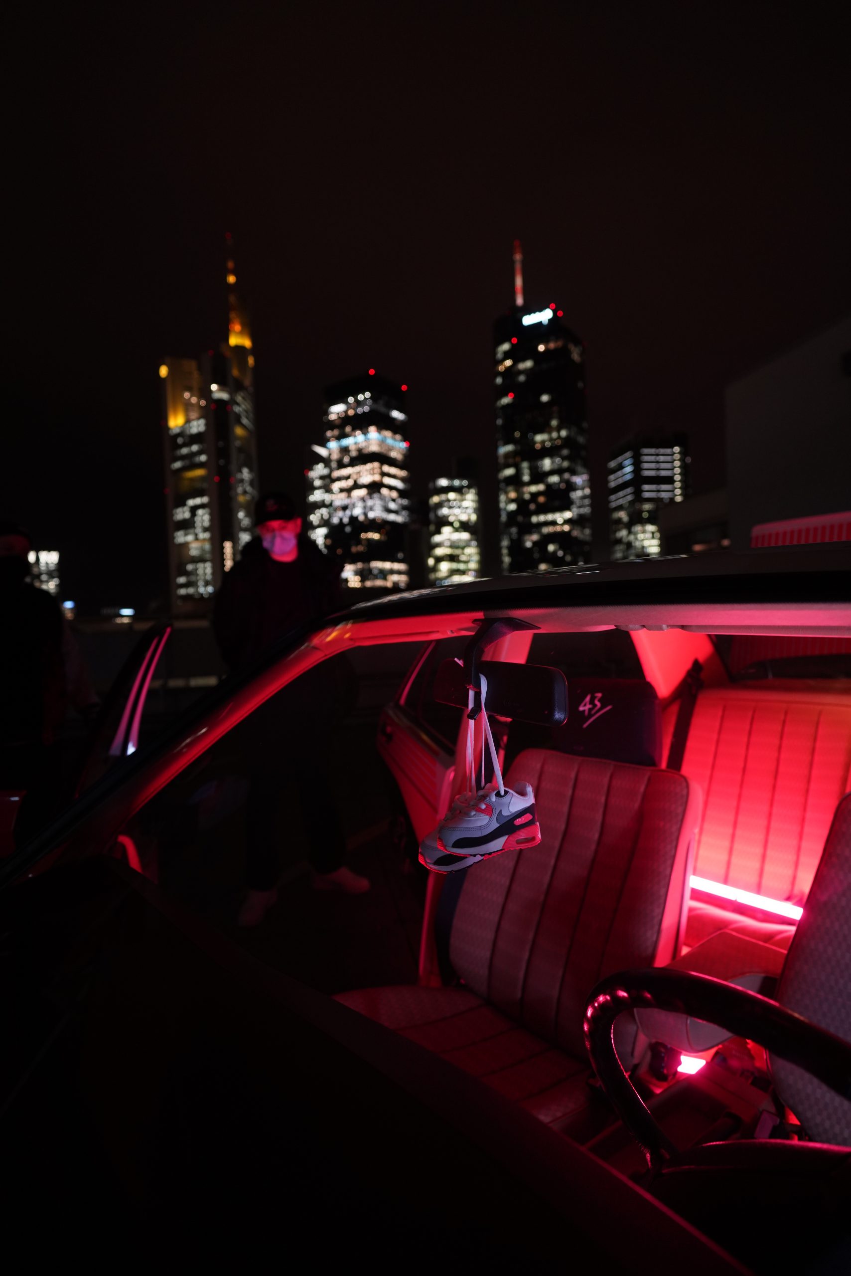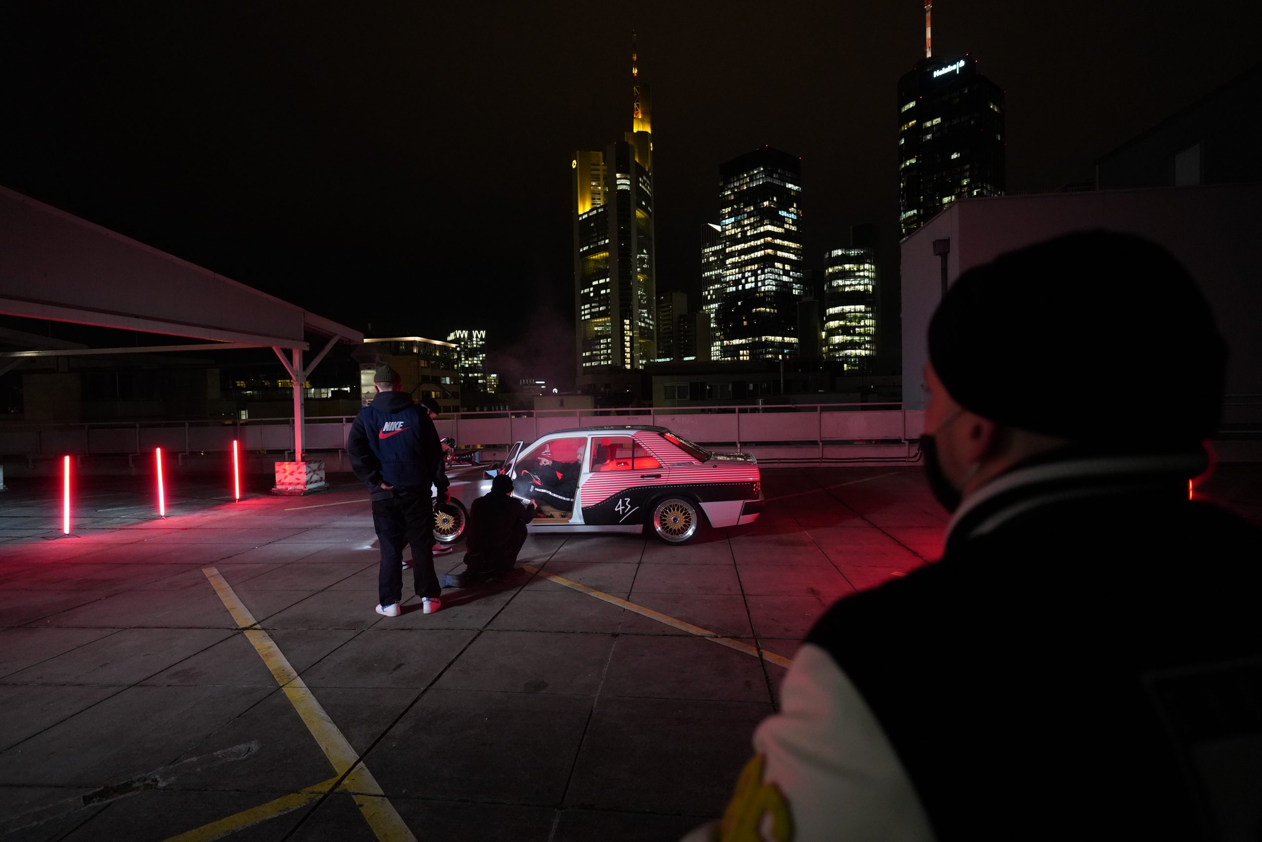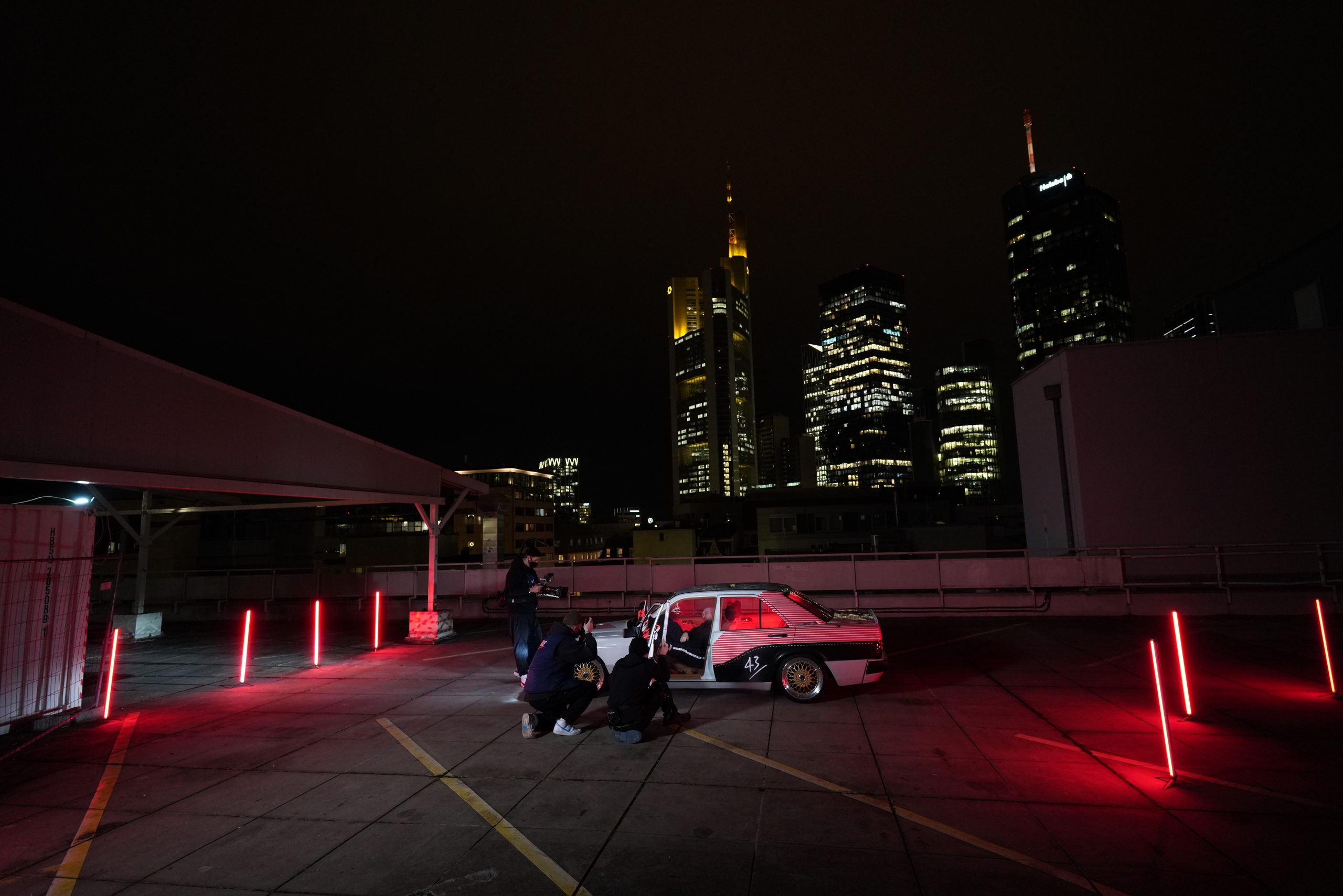 Der Benser lief auf eigener Achse nach »Mainhattan« und die erste Shootinglocation war das Dache des Börsenparkhauses mit Blick auf die Frankfurter Skyline. Mario und Sascha brachten ihre Jungs von photon (Licht) und Martin (Drohne) für die Produktion mit. Nach einem kurzem Outfitcheck im 43einhalb Store mit der KKS-Crew ging es um 17 Uhr dann an der ersten Location im Dunklen los.