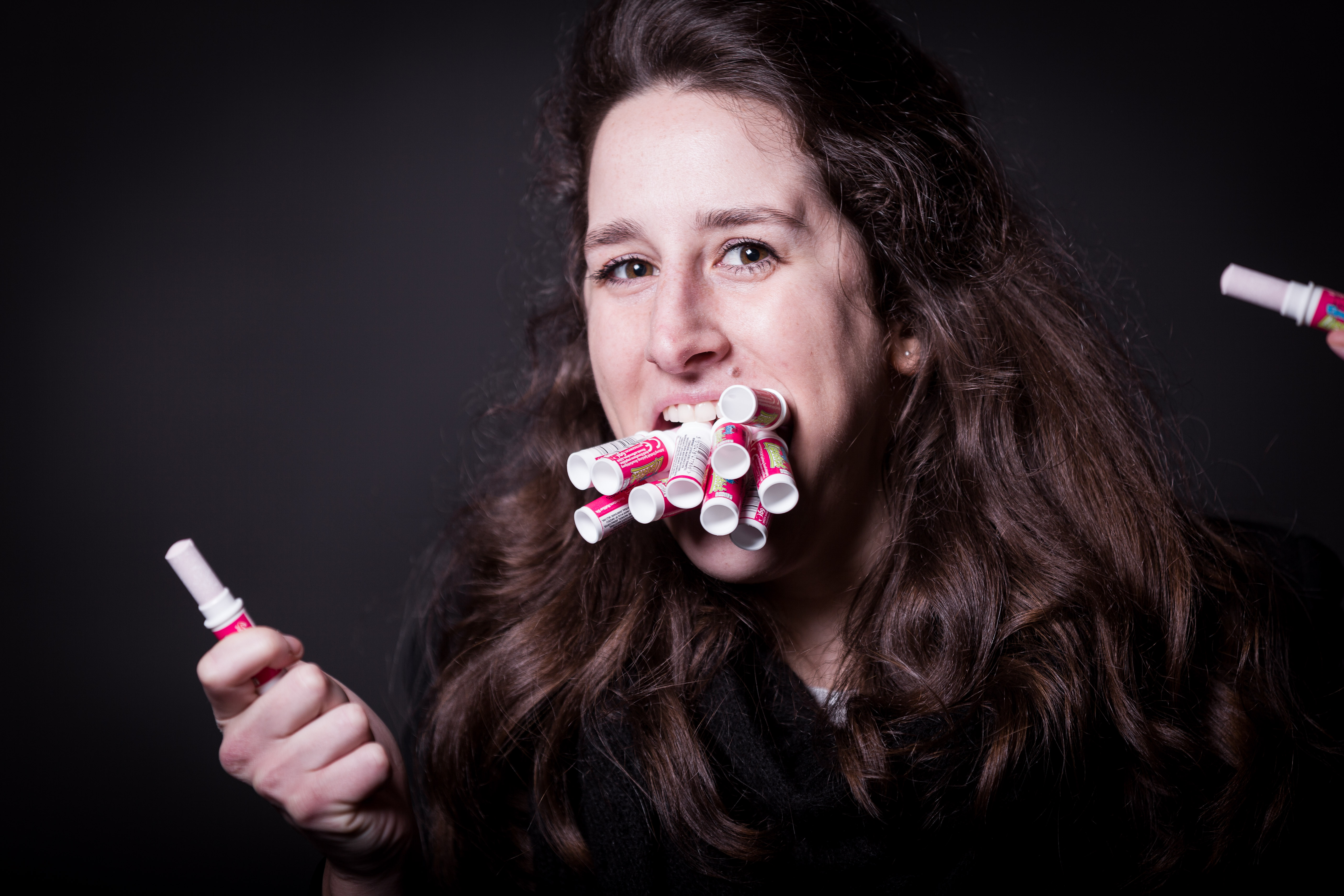 Als wir dann kurz vor Weihnachten die ersten Kisten mit Süßkram geliefert bekommen haben, standen wir vor der großen Frage: “Wie präsentieren wir unseren neuen Schnupp?!?” Schon wenige Minuten später kam die Lösung direkt zu uns ins Büro – in Form meiner guten Freundin Ina. Schnell stand für uns fest, dass sie unser Model sein würde. Eine Ausrede wie “Aber ich bin doch gar nicht geschminkt!/ Ich habe die Haare nicht gemacht!” konnte sie uns zu ihrem Pech und unserem Glück leider nicht vorbringen, da sie selbst gerade vom Fotografen kam und Passfotos hatte machen lassen.