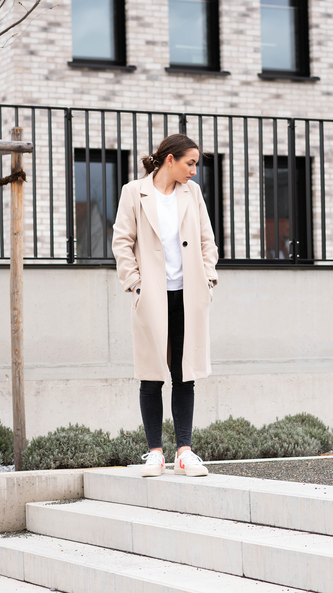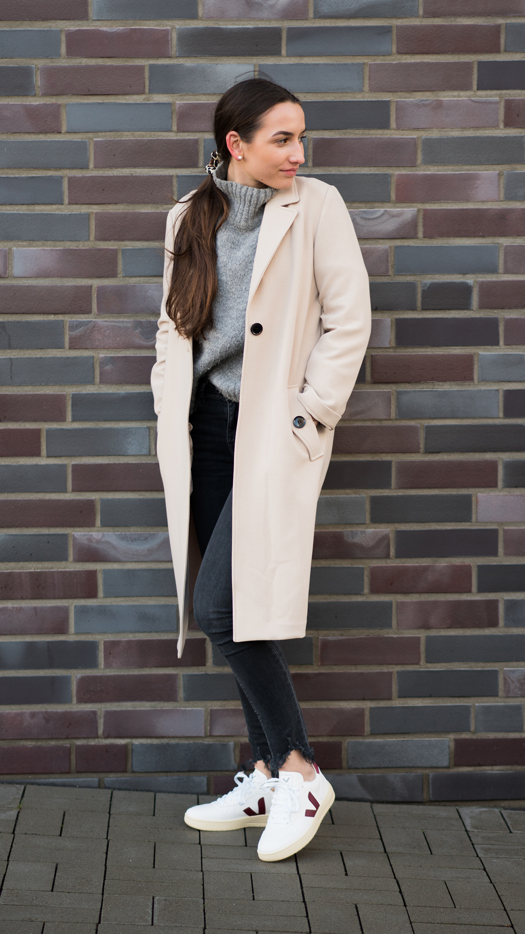 Gerade im Frühling bildet die Kombination aus schwarzen und weißen Teilen das perfekte Übergangsoutfit: Schwarze Hose, schwarzer oder weißer Pulli, Lederjacke drüber und Veja Kicks an den Füßen – fertig ist der lässige Alltags-Look. Natürlich bieten sich ebenso Grau- und Beige-Töne perfekt an, um ein Casual-Outfit zu kreieren – wie bei unserer Karla: Sie kombiniert zu den stylischen Tretern eine schwarze Skinny-Jeans mit einem grauen Rollkragen-Pullover oder weißem Crewneck und darüber einen beigen Mantel.