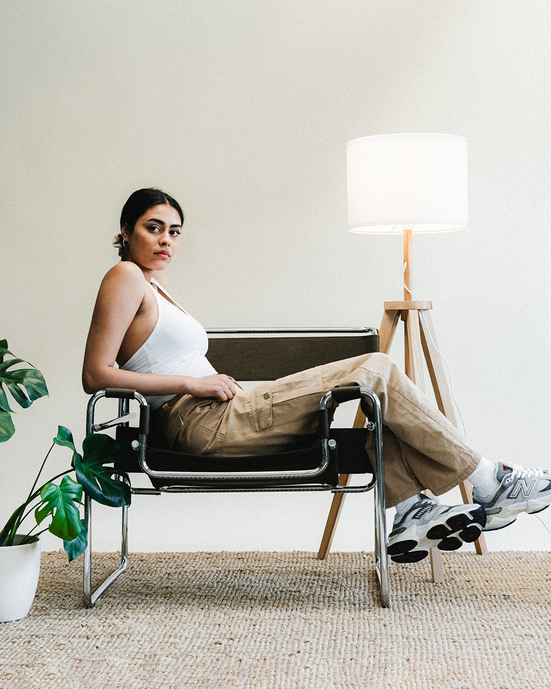 The New Balance 9060 is the perfect choice for those who want the chunky sneaker look and trendy color on their feet. With its bold design and comfortable silhouette, this look makes a statement in style and comfort. It is also super easy to mix and match and adds the finishing touch to any look.
