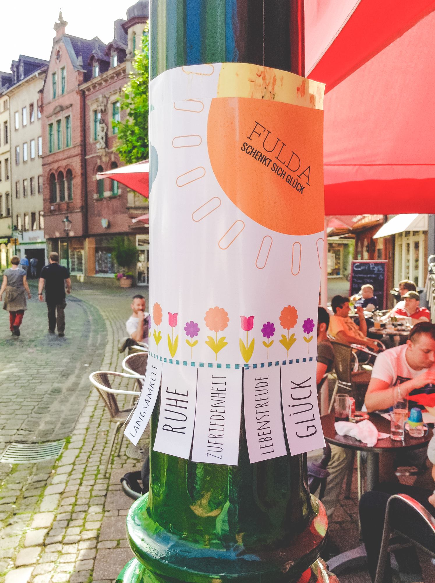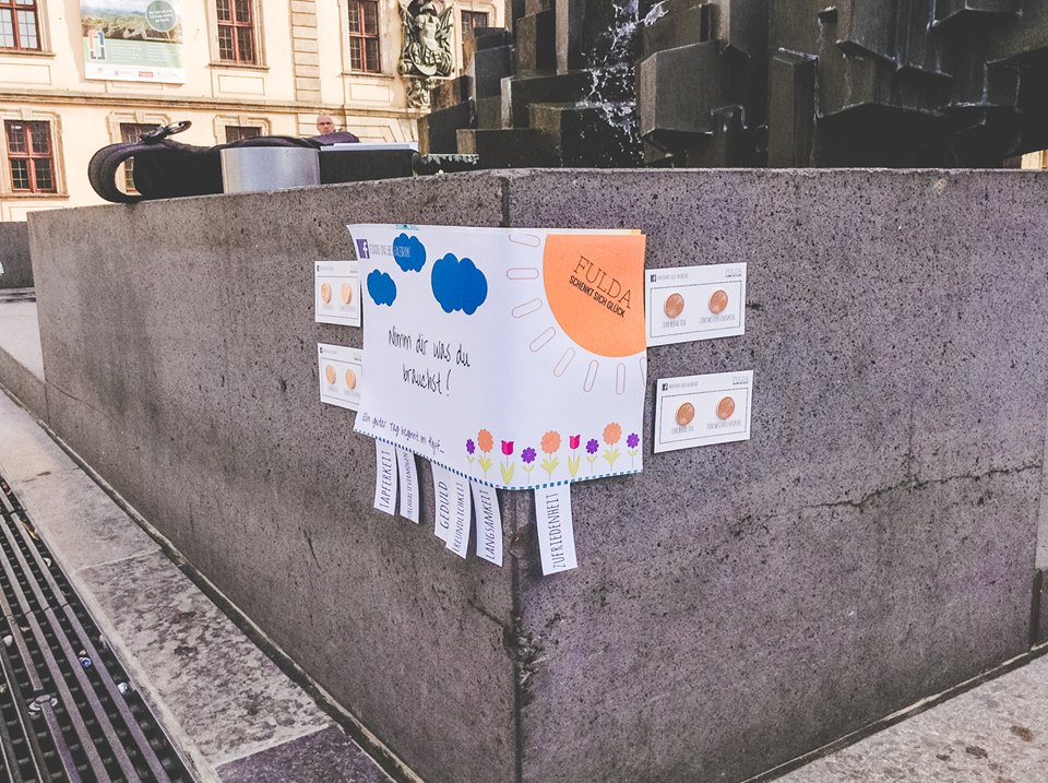 Hmm, die schönste… Ich bin eigentlich kein Fan von Superlativen, aber ich probier’s mal. Ein Erlebnis steht relativ sehr weit oben auf der Liste. Auch wenn die Geschichte eher traurig ist. Im Museumshof habe ich mal ein Pärchen so Mitte 40 angesprochen. Die beiden saßen verlassen in ihrer Ecke und haben eine Hochzeitsgesellschaft beobachtet. Ein echt krasser Kontrast. Auf der einen Seite siehst du ausgelassen feiernde Menschen in Anzügen und Kleidern und auf der anderen Seite zwei vom Leben gezeichnete Personen. Der Mann hat erzählt, dass seine Freundin an Multiple Sklerose erkrankt ist und wie belastend das für beide ist. Er hat erzählt, dass er täglich zehn Stunden Stapler fährt, um dann nachmittags und abends seine Frau zu pflegen. Aber mit dem Arbeiten aufhören kann er nicht, einfach weil die beiden auf das Geld angewiesen sind. Eigentlich hat nur er wirklich gesprochen. Seine Freundin hat ab und zu hochgeschaut, gelächelt und genickt. Du hast echt gemerkt, wie schlecht es ihr körperlich und psychisch geht. Am Ende des Gesprächs haben sich die beiden bei mir bedankt. Für das Glück, das ich ihnen geschenkt habe, und das sie in der Tat so viel mehr als andere gebrauchen können. Aber noch mehr dafür, dass ich einfach nur zugehört habe. Es war echt krass, wie viel es den beiden augescheinlich gegeben hat, dass alles was da auf dem Herzen lag einfach mal raus konnte. Dass jemand einfach nur zuhört und Verständnis und Mitgefühl entgegenbringt. Das hat mich ein Stück weit geerdet. Und es hat mir gezeigt, dass Fulda schenkt sich Glück Menschen wirklich etwas geben kann.