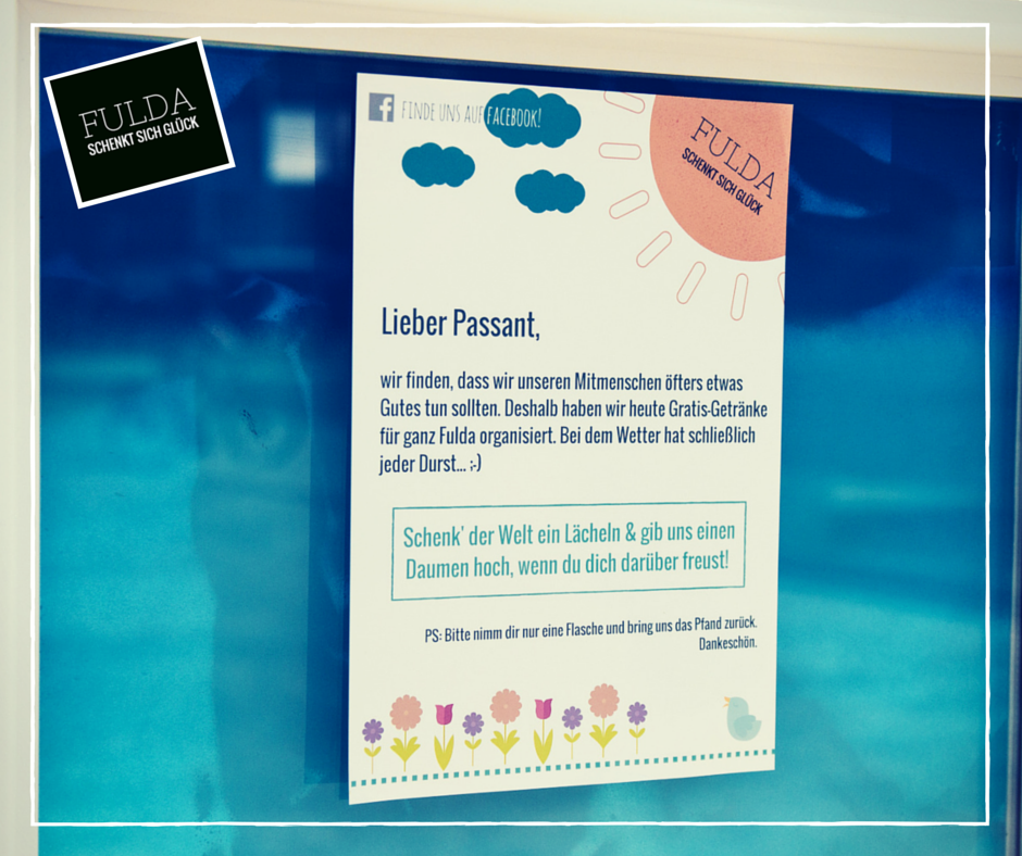 Aufmerksame Beobachter konnten heute in der Innenstadt Fuldas ein paar wunderschön bemalte und bis obenhin gefüllte Getränke-Kühlschränke entdecken. Was es damit auf sich hat und die Geschichte hinter dem Projekt „Fulda schenkt sich Glück“ erzählt uns Martin, der das Ganze mit viel Arbeit und noch mehr Herzblut ins Leben gerufen hat.