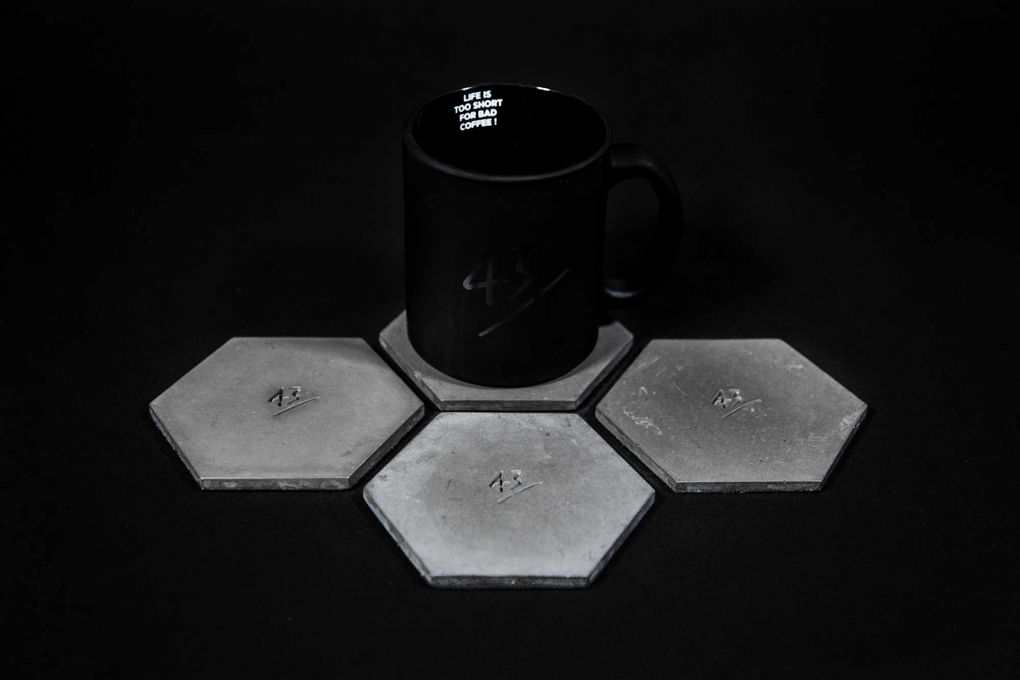 In ihrem wachsenden Portfolio findet man auch edle, sechseckige Getränke-Untersetzer in verschiedenen Farben. Die perfekte Ergänzung zu unseren geliebten Tassen. Madlen und Daniel haben sogar eigens für uns eine 43einhalb-Serie der Beton-Untersetzer kreiert.