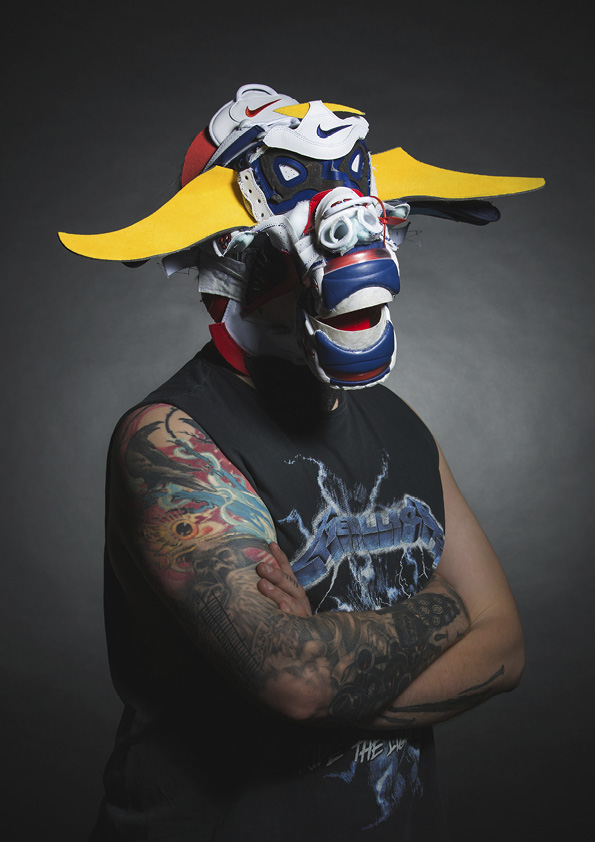 Chris: Durch meine Arbeit als Bildhauer beschäftige ich mich schon sehr lange mit Masken, deren Bedeutung und Wirkung auf den Träger, als auch den Betrachter. Das Tragen von Masken ist in der Kultur und Historie des Menschen stark verwurzelt und hat seinen Ursprung im Religiösen und Rituellen. Eine Maske kann etwas verbergen oder aber Ausdruck einer inneren Wahrheit sein und somit etwas sichtbar machen. Da wir tagtäglich von Sneakern umgeben sind, haben wir 1+1 zusammengezählt und das Schicksal seinen Lauf nehmen lassen. Das Design der einzelnen Masken entsteht quasi unabsichtlich während des Prozesses. Es gibt keinen Entwurf, der am Anfang steht. Just Try and Fail.