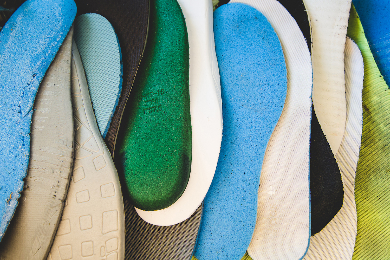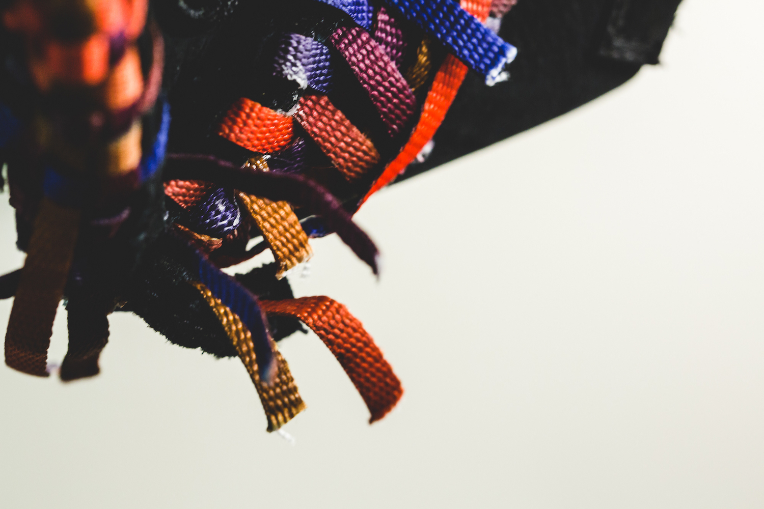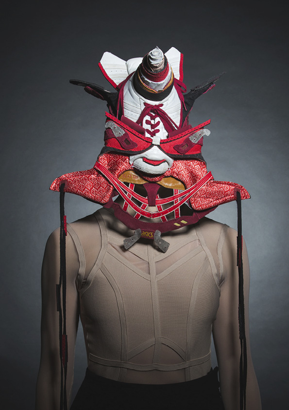 Chris: Das ist ein ziemliches Gemetzel. In der Regel stecken in einer Maske 2-3 Paar Sneaker, die farblich zusammenpassen und ordentlich Material hergeben. Dann beginnt das Sezieren mit Skalpell, Säge oder in besonders harten Fällen, der Axt. Es ist total spannend, die Puzzleteile eines Sneaker vor sich zu haben und sie völlig neu zusammen zu setzen. Das passiert mit der guten alten Heißklebepistole. Wichtigstes Werkzeug eines jeden Bildhauers.