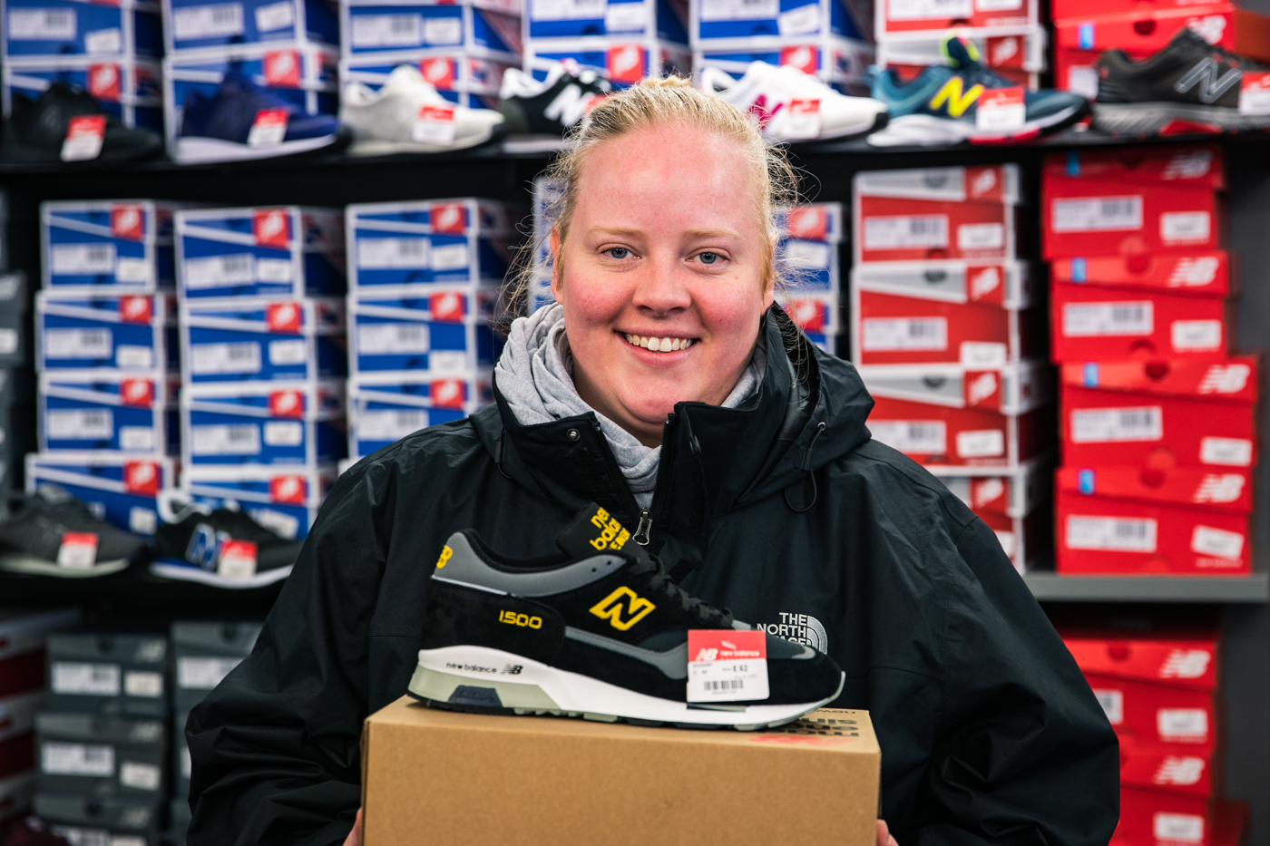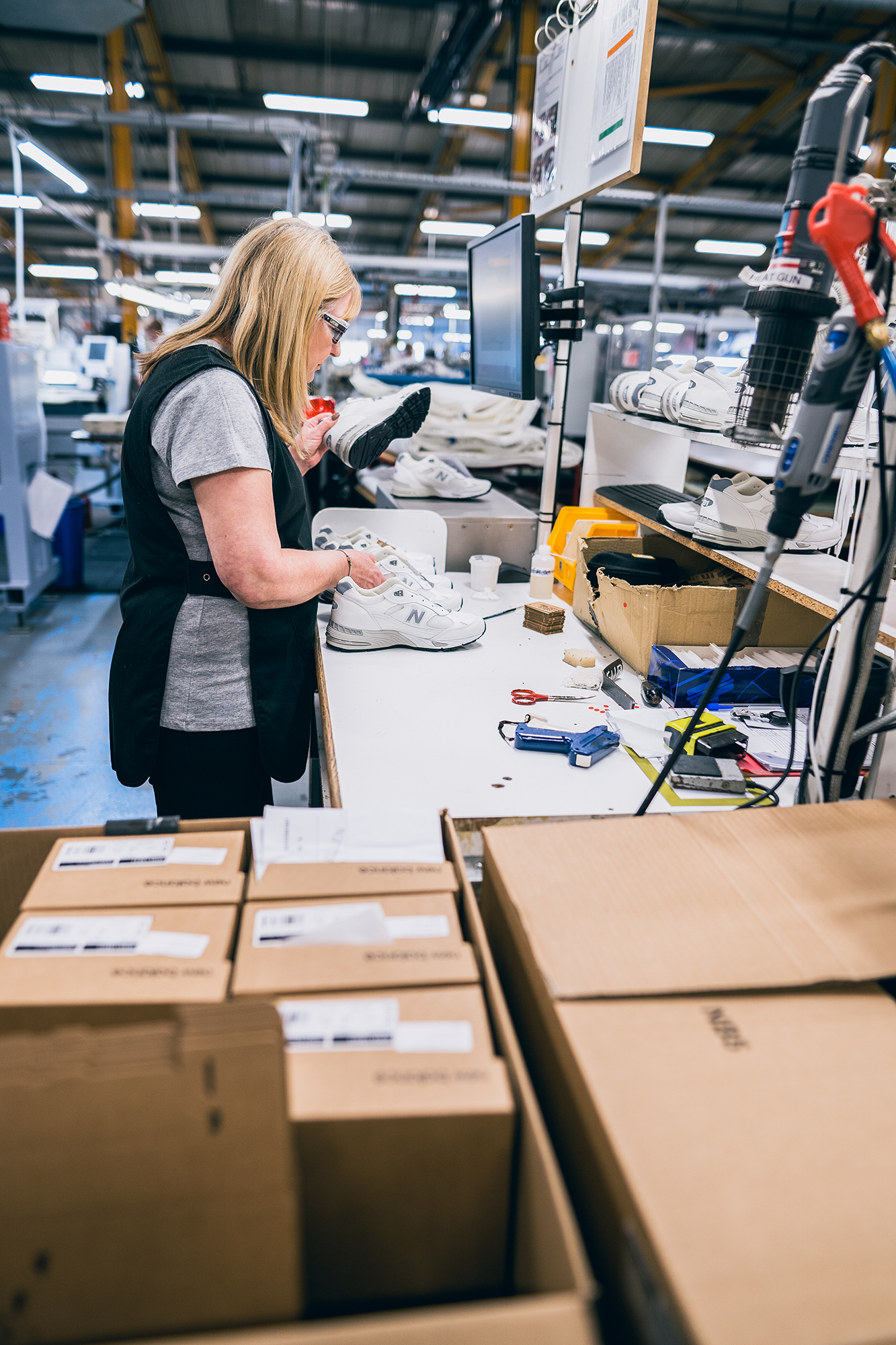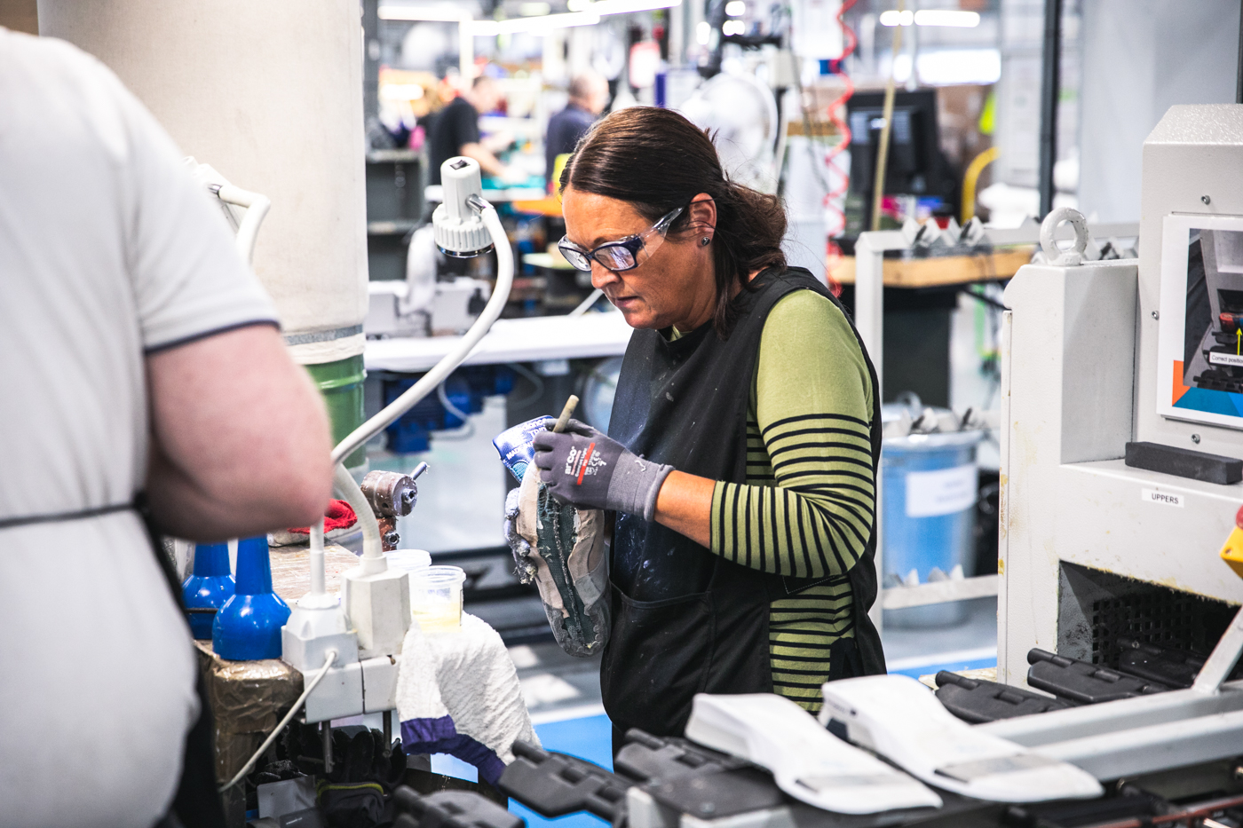New Balance wurde 1906 in Boston, Massachusetts vom englischen Einwanderer William J. Riley gegründet (da kommt auch die Verbindung zu UK her) gegründet. Ursprünglich stellte die Brand orthopädische Schuheinlagen her, bevor in den 1930ern die ersten revolutionäre Laufschuhe vom Band gingen. 1982 kaufte der damalige Besitzer von New Balance in Workington eine Fabrik, wo er zum ersten Mal NB-Schuhe in England herstellen ließ. Zu der Zeit schlossen nach einander viele Schuhmanufakturen in der Region Cumbria und Besitzer Jim Davis erkannte, dass er in der Gegend sowohl die Skills, als auch die Mitarbeiter für eine eigene Schuhfabrik finden würde. In Irland wurde zu dem Zeitpunkt schon einige Zeit produziert. Zu Beginn arbeiteten knapp 40 Mitarbeiter in der Fabrik. 1991 wurde das heutige Gelände in Flimby, nur wenige Kilometer südlich von der ursprünglichen Fabrik, übernommen. Seitdem wächst die Produktion und auch die Zahl der Angestellten stetig, ohne aber künstlich die Mengen zu vergrößern. Aktuell ist die Einführung von Robotern, die bei der Herstellung helfen sollen, eine Challenge, die bewältigt wird. Mehr als 25.000 Paar Schuhe können so pro Woche hergestellt werden.Viele der AKTUELL 285 Mitarbeiter der Fabrik arbeiten seit mehr als 15 Jahren dort und wohnen im Umkreis von weniger als 10 Kilometer. It’s a local business!
