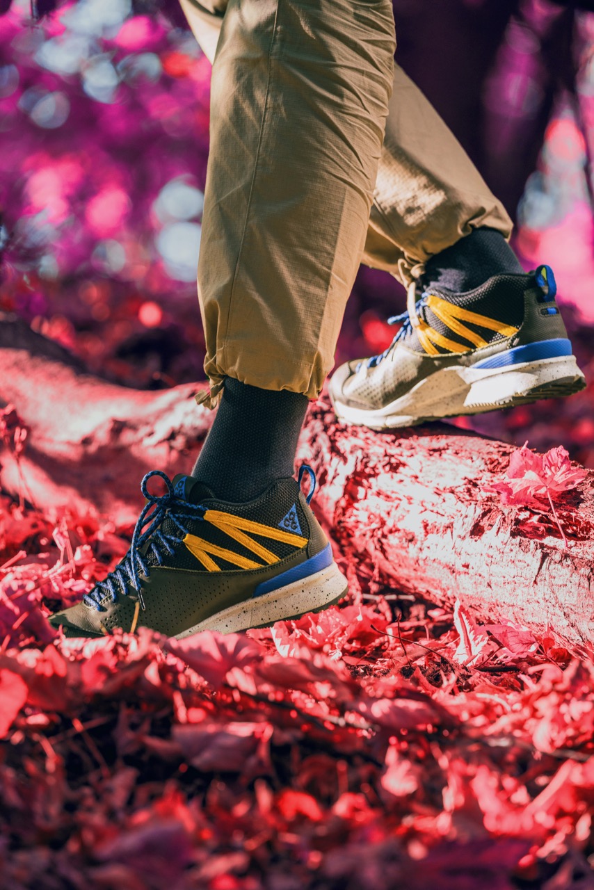 1989 war Nike zwar längst im Hiking-Bereich zu Hause, doch zum ersten Mal trug eine Kollektion damals das “ACG” Siegel, das fĂĽr “All Conditions Gear” steht und den Anspruch hat, besonders strapazierfähige und allwettertaugliche Kleidung und Schuhe emporzubringen. Seitdem erblickten so immer wieder Apparel und Footwear Kollektionen das Licht der Outdoor-Welt, darunter auch viele heutige Klassiker wie der Air Mowabb oder der Wildwood,  aber auch eigenwillige Exponate wie die Air Deschutz Sandale. Nach einigen Jahren unter der Leitung von Acronym-GrĂĽnder Errolson Hugh, in denen der Style von ACG sich stark in Richtung Tech veränderte, bringt Nike seit 2018 wieder Kollektionen auf den Markt, die sowohl von den Schnitten, als auch von ihrer Farbwelt stark an Nike ACG aus den 1990er Jahren angelehnt sind.