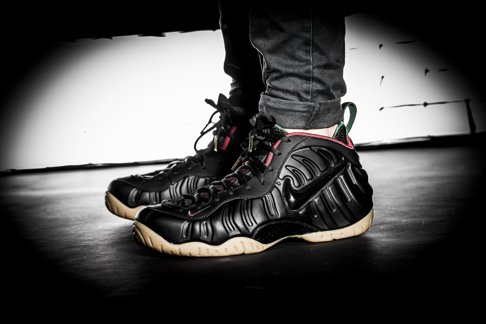 Auch wenn mit einigen verschiedenen Farben verarbeitet wurden, wirkt der Foamposite in dieser Version doch eher schlicht. Der Basketballschuh kommt mit einem matt-schwarzen Lederupper, rotem Innenfutter und dezenten grünen Details. Und wer jetzt genau aufgepasst hat, weiß, dass es sich hierbei um die klassischen Farben des italienischen Modelabels Gucci handelt. Abgerundet wird der edle Look durch eine Gumsohle und goldene Lace-Tips. Eine wirklich gelungene Kombination aus Colorway, Material und Silhouette!