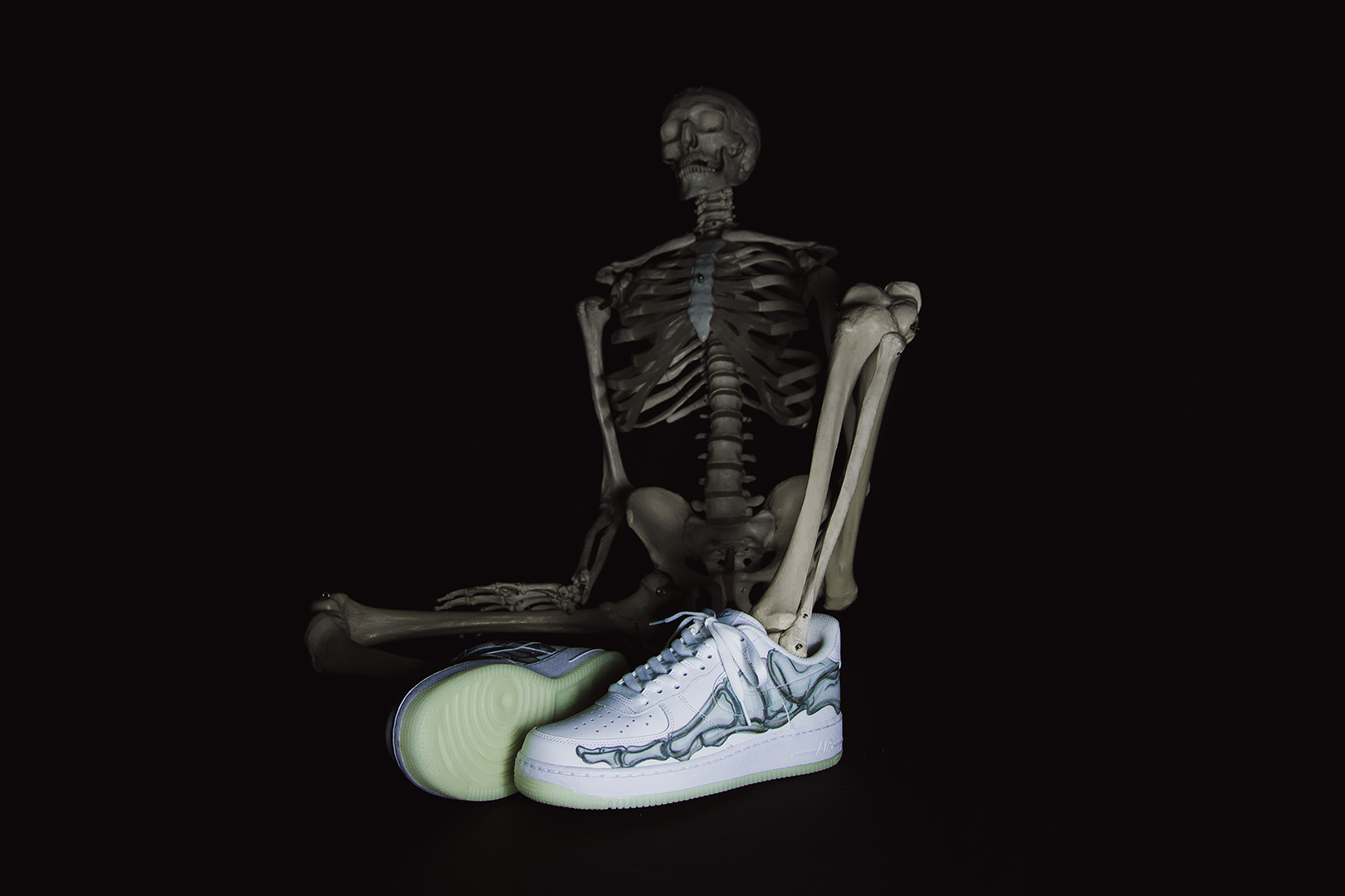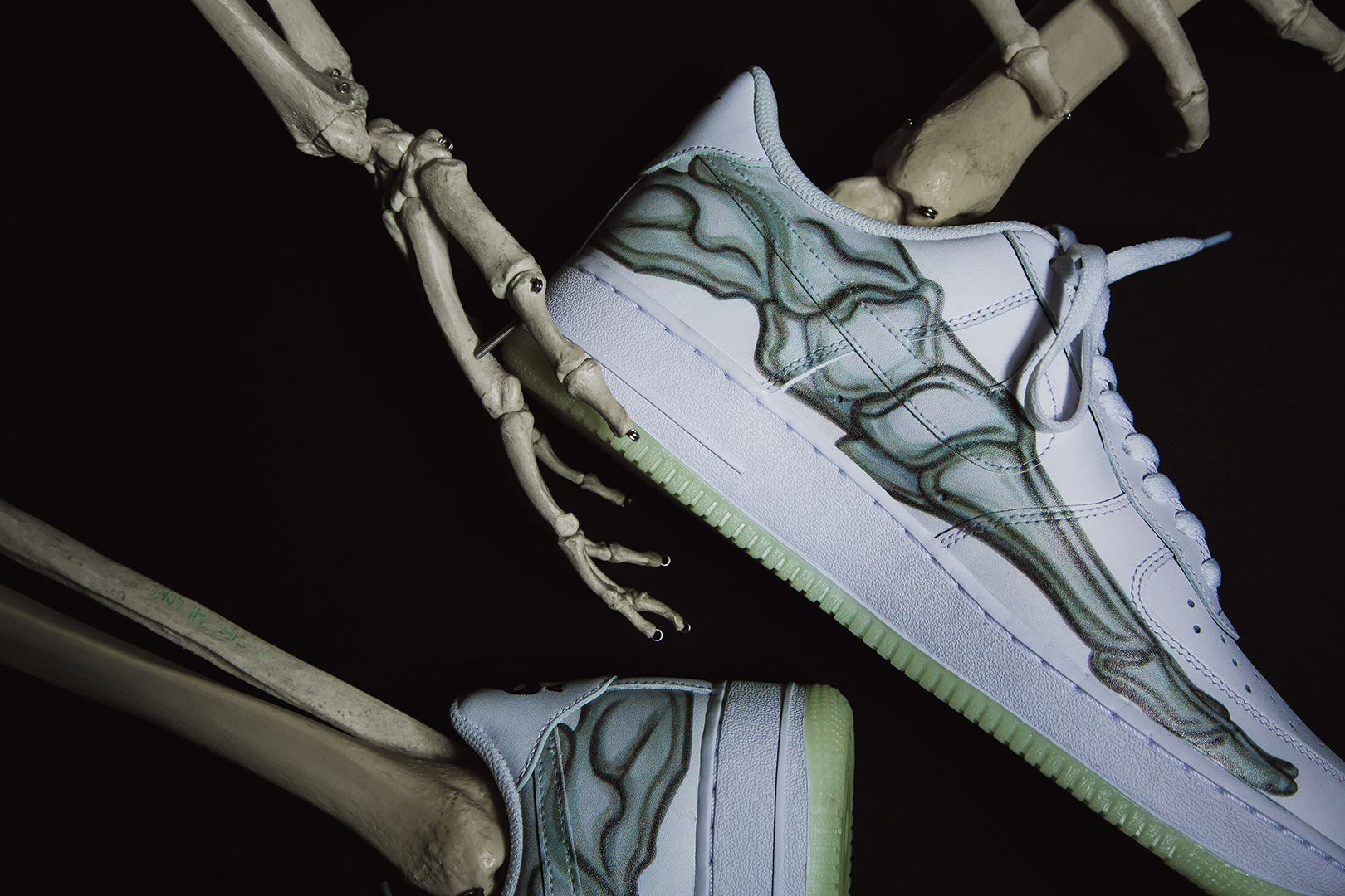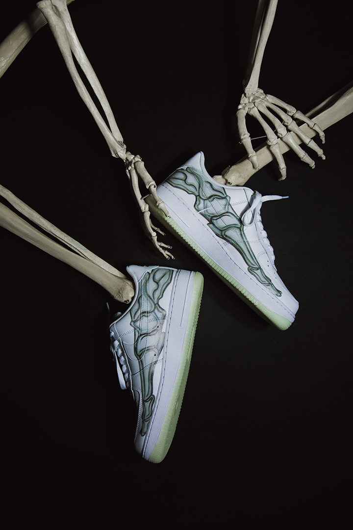 Der Skeleton kombiniert das klassische Leder-Upper, wie man es vom Air Force 1 kennt, mit schaurigen Details. Auf der Seite des Schuh befindet sich ein Skelett-Print, ebenso auf der Innensohle des Schuhs. Besonderes Highlight ist jedoch die Außensohle des Skeleton: es ist fluoreszierend und leuchtet somit im Dunkeln!