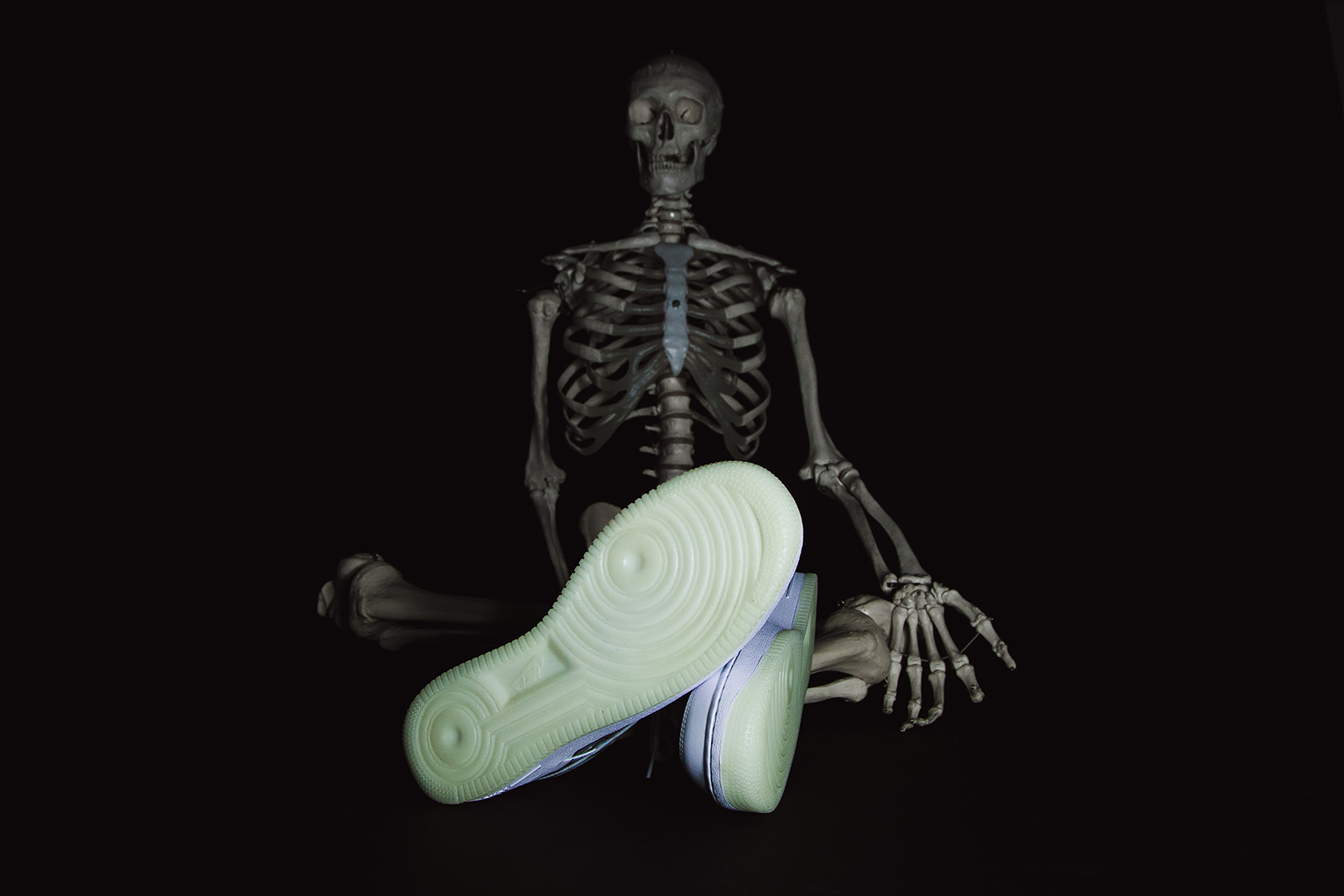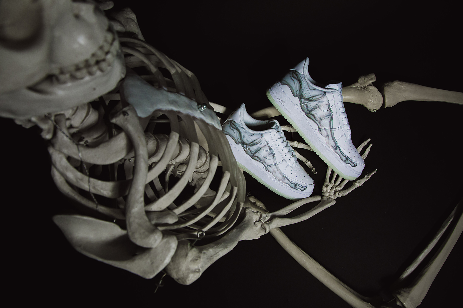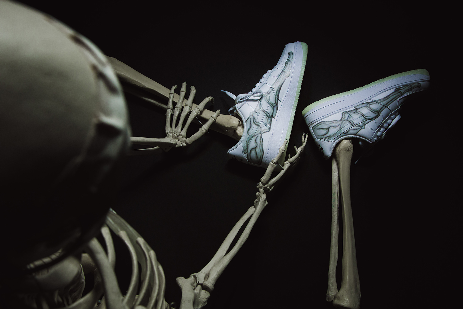 Der Skeleton kombiniert das klassische Leder-Upper, wie man es vom Air Force 1 kennt, mit schaurigen Details. Auf der Seite des Schuh befindet sich ein Skelett-Print, ebenso auf der Innensohle des Schuhs. Besonderes Highlight ist jedoch die Außensohle des Skeleton: es ist fluoreszierend und leuchtet somit im Dunkeln!