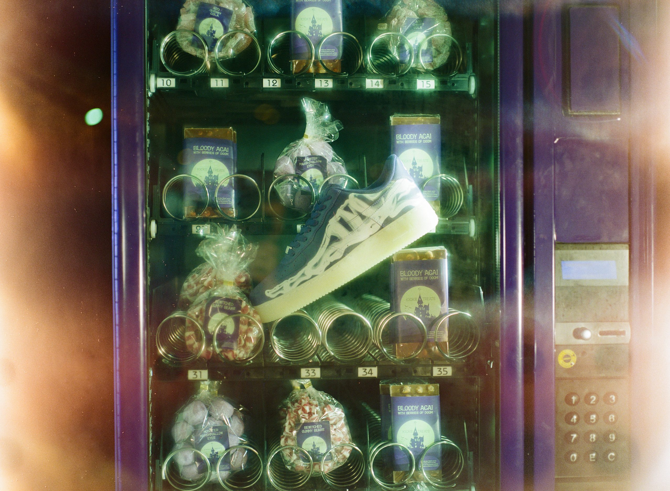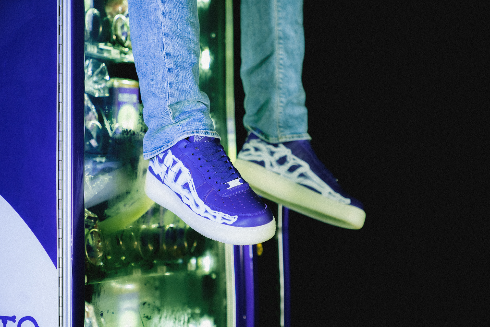 The Special Edition Nike Air Force 1 ’07 Skeleton comes in an eerie, beautiful purple colorway with the foot of a skeleton stretching across the premium leather upper to represent the wearer’s foot. The previously appeared X-ray effect is also used on the sneaker’s insole with a gray bone graphic and the Nike lettering on the tongue that is also reminiscent of human bones. To add a special effect to the eerie look, the skeleton is complemented/rounded off/finished off with a Glow-In-The-Dark outsole.