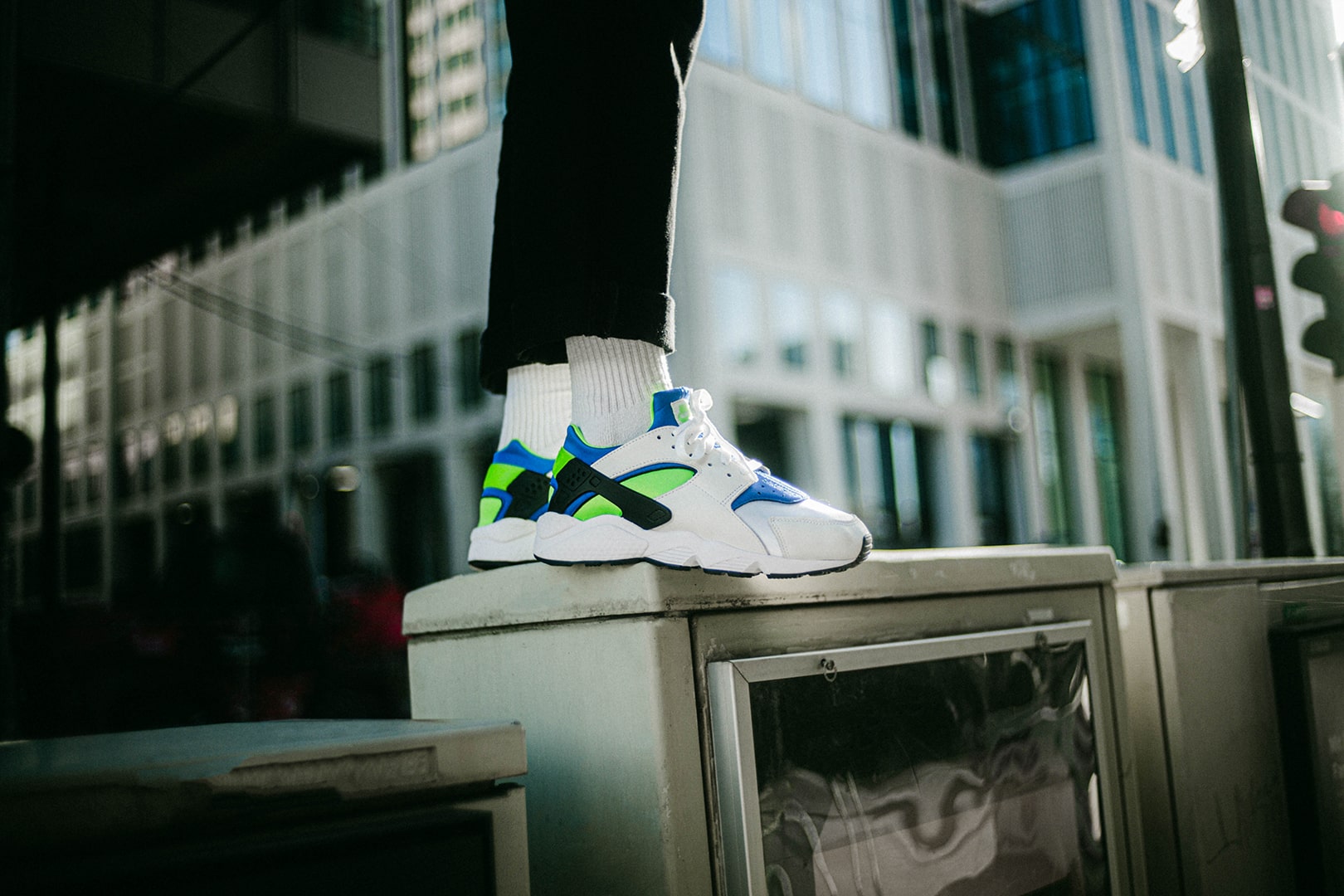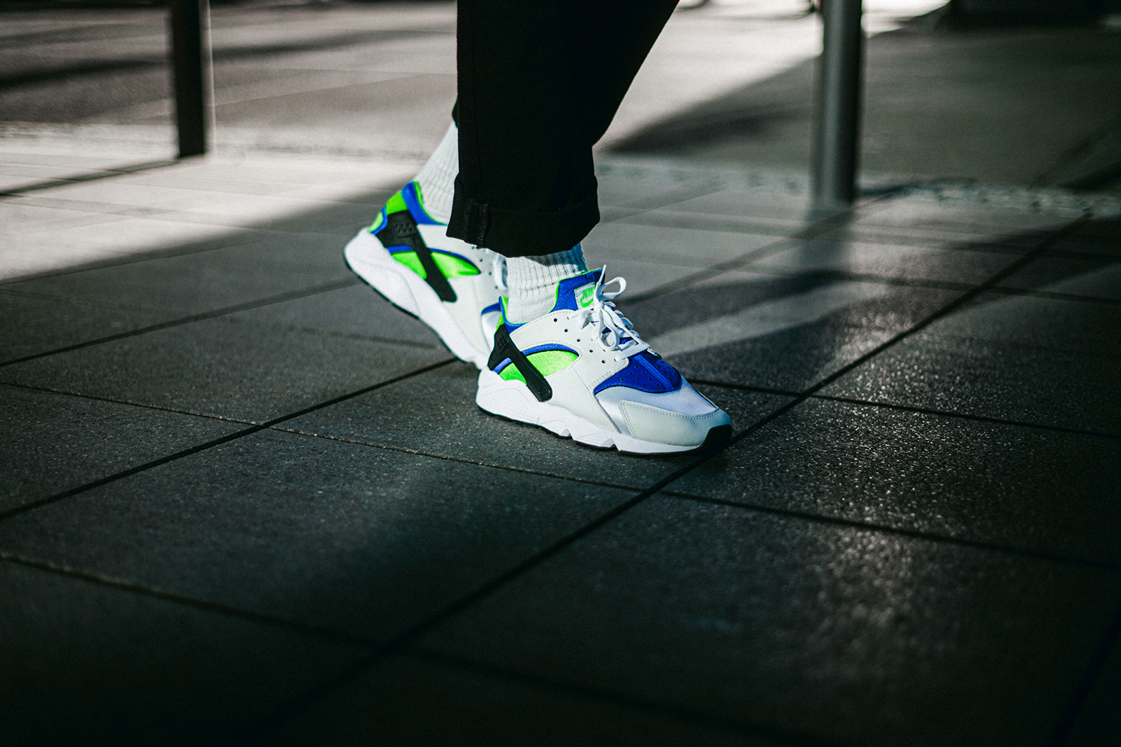 Der Air Huarache »Scream Green« kommt mit einem Materialmix aus Leder und atmungsaktivem, neoprenähnlichem Material daher, so wie wir ihn kennen und lieben. Neben viel Weiß sehen wir grüne, blaue, als auch schwarze Farbakzente. Viele weitere, vertraute Details bleiben unverändert, darunter der tief ausgeschnittene Kragen, der charakteristische Fersenclip und die bootieähnliche Konstruktion.