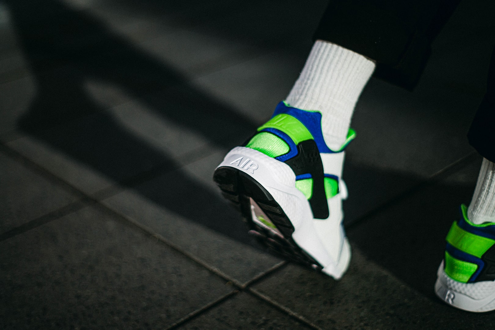 Der Air Huarache »Scream Green« kommt mit einem Materialmix aus Leder und atmungsaktivem, neoprenähnlichem Material daher, so wie wir ihn kennen und lieben. Neben viel Weiß sehen wir grüne, blaue, als auch schwarze Farbakzente. Viele weitere, vertraute Details bleiben unverändert, darunter der tief ausgeschnittene Kragen, der charakteristische Fersenclip und die bootieähnliche Konstruktion.
