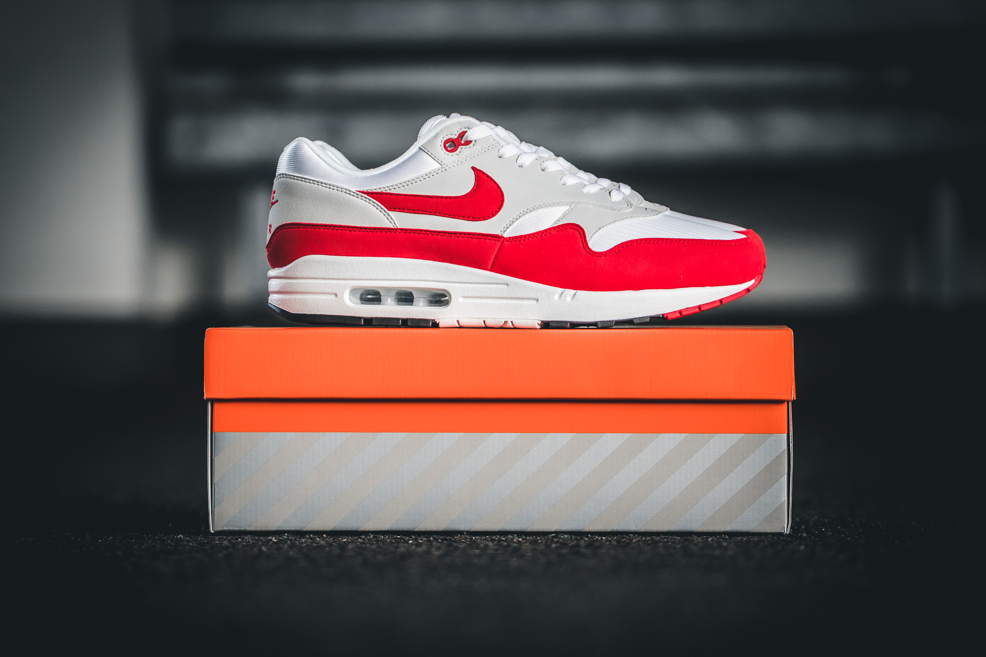 Der Nike Air Max 1 »Anniversary – OG Red« wird hier bei uns im Shop erhältlich sein: