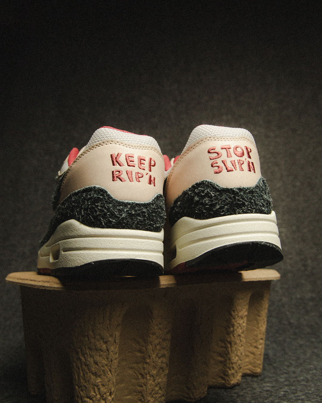 Die Ferse und die Innensohle sind mit roten Stickereien verziert, auf denen »KEEP RIP’N« und »STOP SLIP’N« zu lesen ist, während die Mini-Swooshes den Look vollenden.