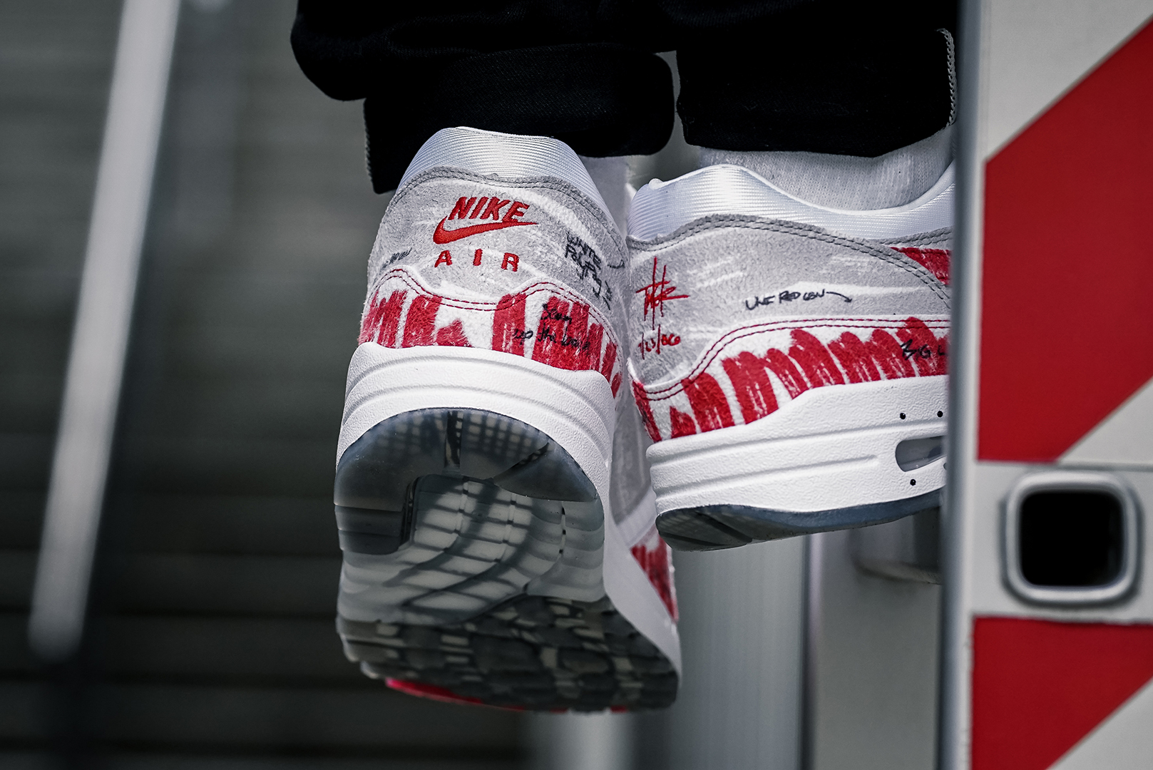 Wie auch auf den Skizzen wurden die Mudguards und Swooshes des 1er Air Max nicht vollständig mit roter Farbe ausgefüllt. Auf der Zunge befindet sich Tinker Hatfields erstes Konzept für ein Air Max-Logo. Durchgehende handschriftliche Notizen bringen euch der Vision von Hatfield näher. Abgerundet wird das Design vom Schriftzug »SKETCH, PROPERTY OF NIKE NOT FOR RESALE«, der das Innenfutter ziert.