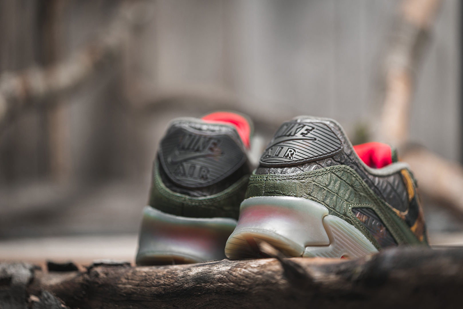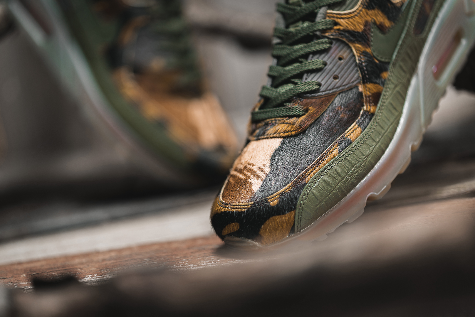 In diesem Jahr präsentierte Nike schon so einige krasse CWs vom AM90, wie den »Mars Landing«, »Viotech«, »Vinyl« oder »Camowabb«. Jetzt legt der Swoosh noch einmal nach und stattet das Upper der Ikone mit einem genialen Material-, Muster- und Farbmix aus: Die Toebox und Teile des Lacings wurden mit Ponyhair in Camo-Mustern ausgestattet, während olivgrünes und braunes Leder mit Kroko-Mustern das restliche Upper schmücken. Die restlichen Parts des Lacings und die Nike Air Max Brandings an den Seiten und der Ferse kommen im selben Material wie die Icy-Mittelsohle, die übrigens unser persönliches Highlight ist. Durch das halb-durchsichtige Material schimmert die rote Air-Unit in der kompletten Mittelsohle durch und bildet damit einen genialen Kontrast zum restlichen Upper.