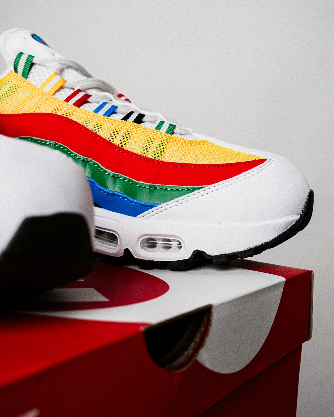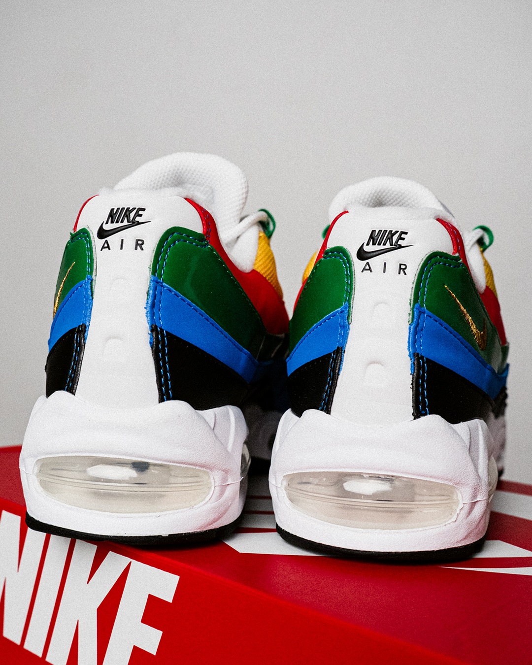 Diesen farbenfrohen AM95-Colorway haben wir zuletzt 2004 gesehen. Die Neuauflage glänzt mit dem auffälligen, mehrfarbigen Kunstleder, satten Kontrasten und der griechischen Flagge auf der Zunge – eine Hommage an die Olympischen Spiele in Athen.