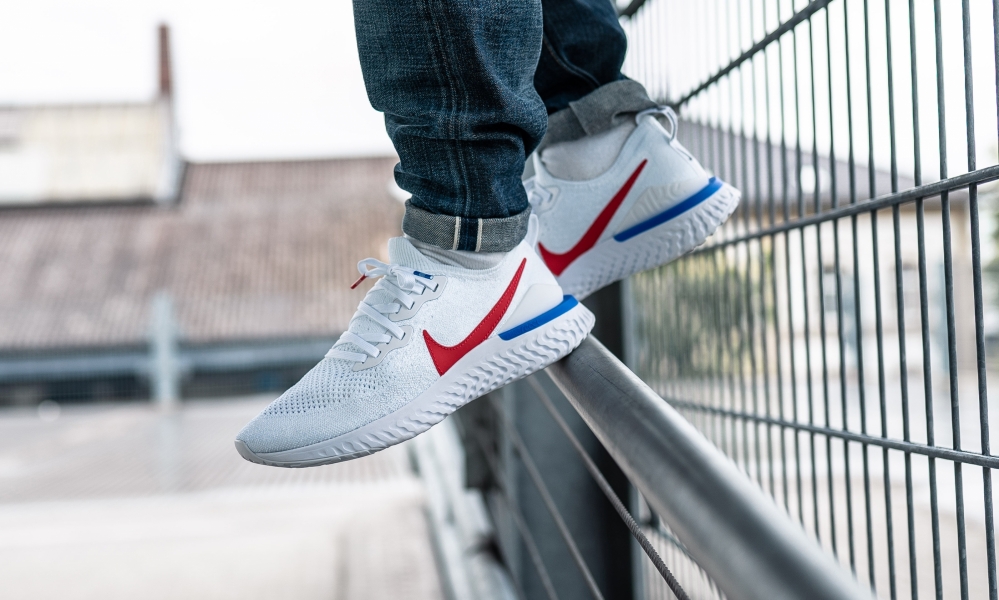 Was bei diesem Colorway des Epic React jedoch besonders auffällt, ist zunächst der Colorway. Den kennen wir – nicht nur irgendwoher. Weißer Grund, roter Swoosh, blau zwischen Upper und Midsole? Ihr habt richtig geraten, das ist der klassische CORTEZ Colorway, den Nike bereits seit den 1970er Jahren produziert und der nicht nur Tom Hanks in Forrest Gump gut gefiel. Im Gegensatz zu den anderen Epic React Colorways ist ausserdem der Swoosh aufgenäht, nicht aufgeklebt und an der Ferse befindet sich auf dem Tag sowohl der Blue Ribbon Schriftzug, der an Nike’s ursprünglichen Namen erinnert, als auch ein “Sports Track Club” Wording. Inspiriert ist dies wohl an den ersten Blue Ribbon Sports, die in den 70ern eröffnet wurden, um nicht einfach nur Schuhe zu verkaufen, sondern gleichzeitig ein Treffpunkt für die lokale Laufszene zu sein! Falls ihr zum Cortez noch etwas mehr Hintergrundwissen und Geschichte wollt, dann checkt mal unseren Cortez History Check aus!