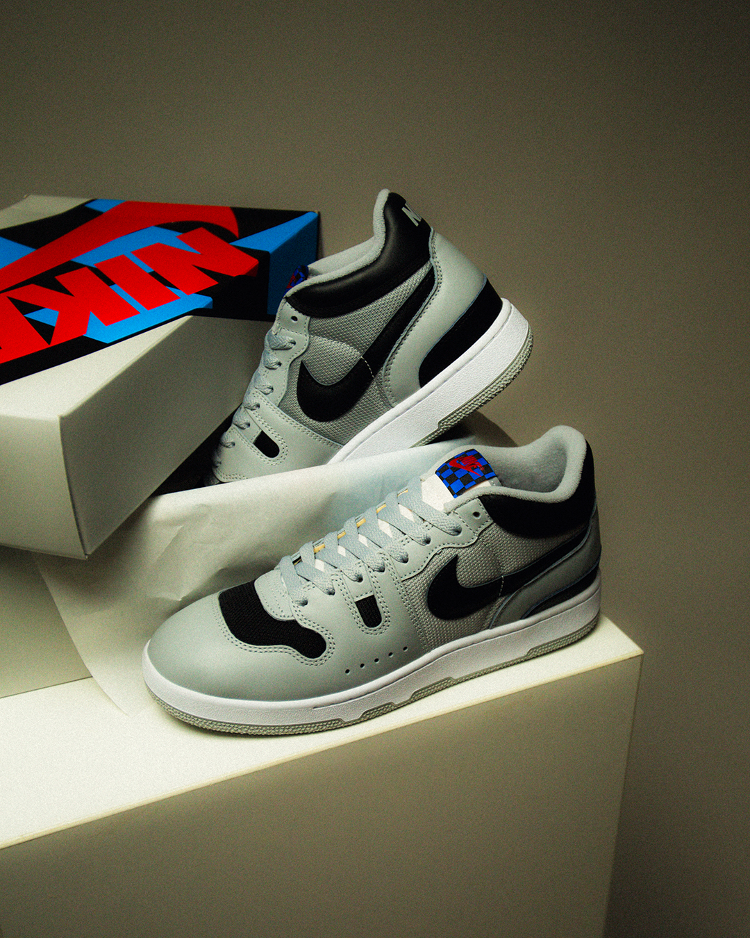 Der Nike Mac Attack OG released hier in seinem originalen Colorway. Das Modell kommt mit einer atmungsaktiven Base aus grauem Mesh daher, während die Overlays aus hochwertigem Glattleder bestehen, was den Schuh funktionell und gleichzeitig robust macht, sodass er sowohl auf dem Court als auch außerhalb des Courts eine gute Figur macht. Die Tongue zeigt natürlich das Checkerboard-Muster, das beim Nike Mac Attack ein absolutes Muss ist. Jedes Paar kommt in einer speziellen Verpackung, die eindeutig vom Look des Schuhs inspiriert ist.