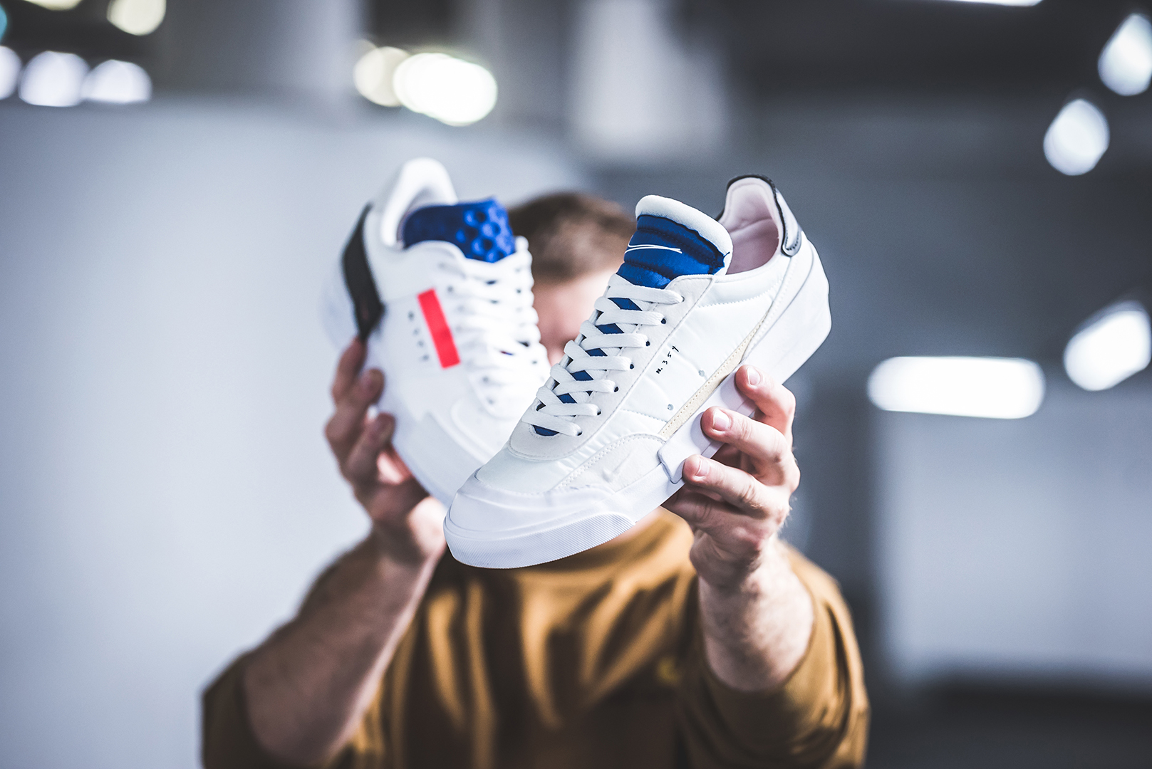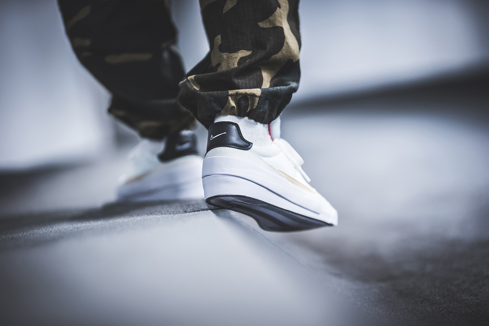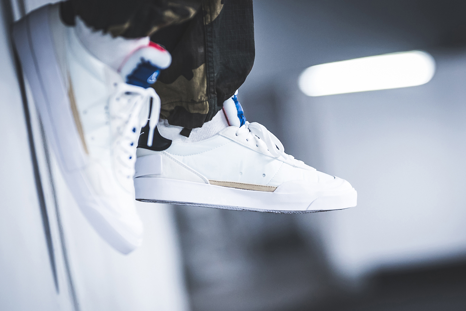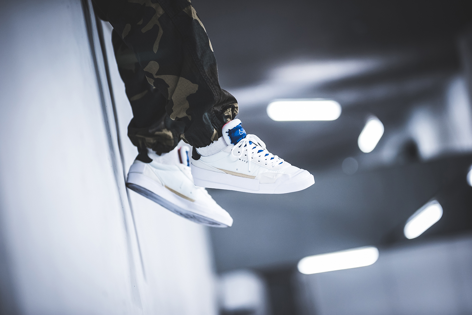 Auch das zweite Teil der Kollektion besticht durch seinen innovativen Look. Beim Nike Drop Type LX »N. 354« dominiert ein Materialmix das weiße Uppe, das mit Bleistift-Skizzen vervollständigt wurde. Die neue Silhouette besticht außerdem durch eine gepolsterte Zunge in Royalblau, dem verstärkten Vorderfuß, rotem Innenfutter und schwarzen Leder-Details an den Fersen.