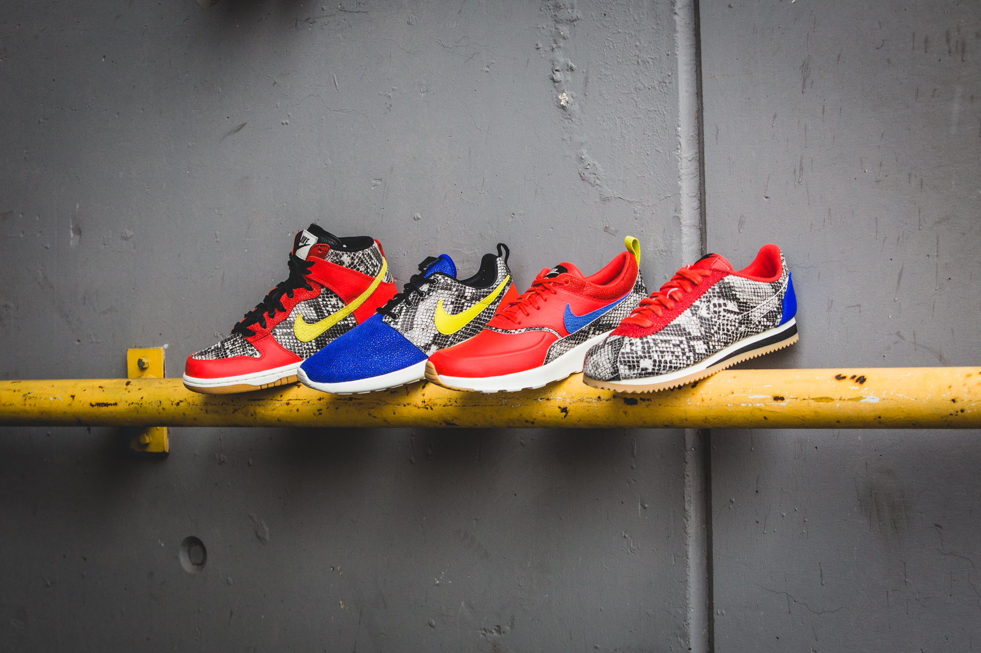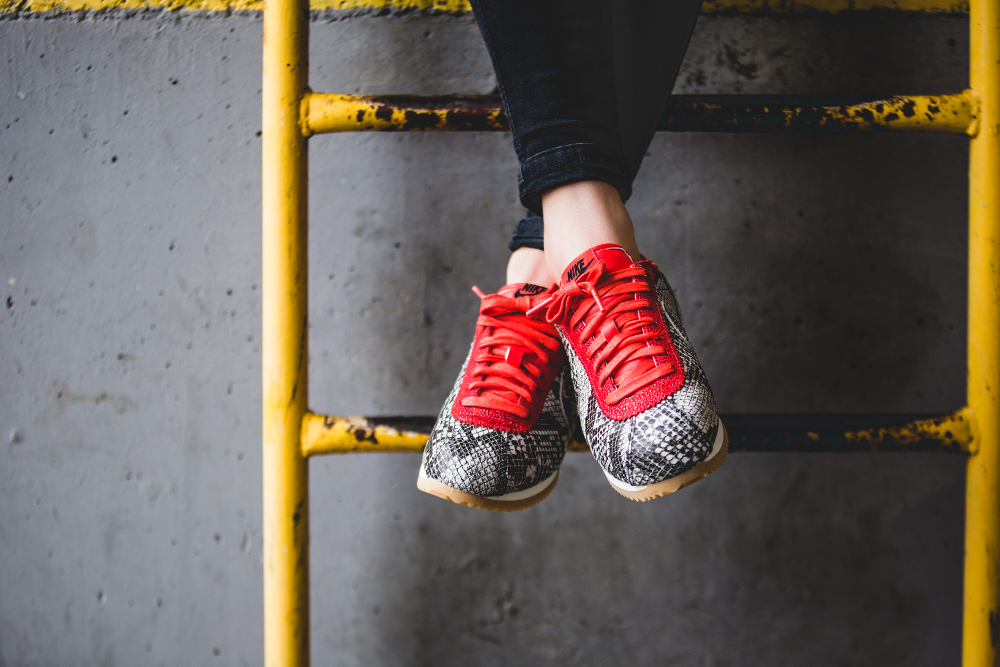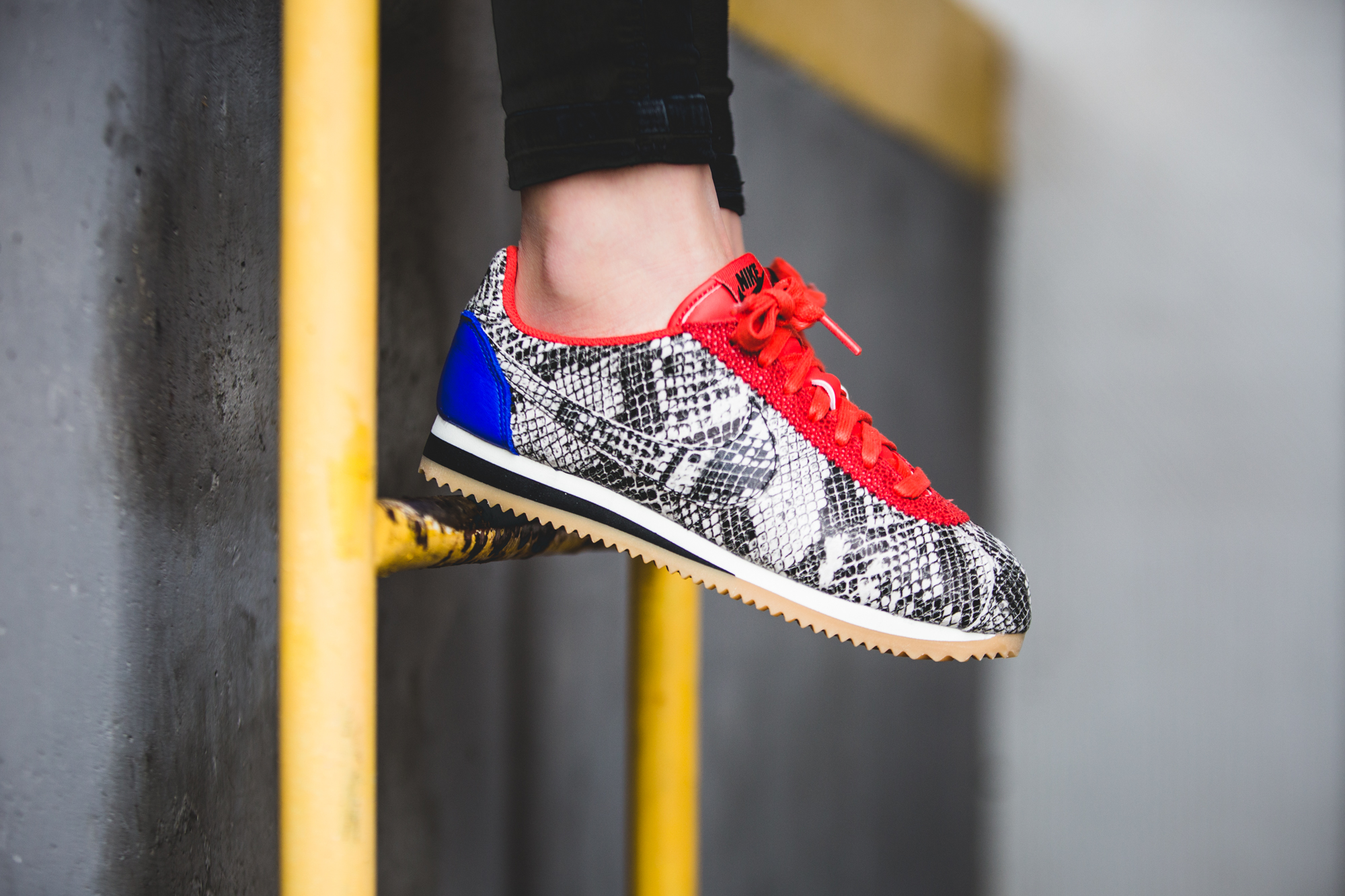 Sei es der Classic Cortez, der Roshe One, der Air Max Thea oder der Dunk High – alle diese Klassiker für Mädels wurden mit einem Farbmix aus Blau, Gelb, Rot, Schwarz oder Weiß versehen. Der eigentliche Hingucker ist allerdings der farblose Part in der wilden Schlangenleder-Optik.