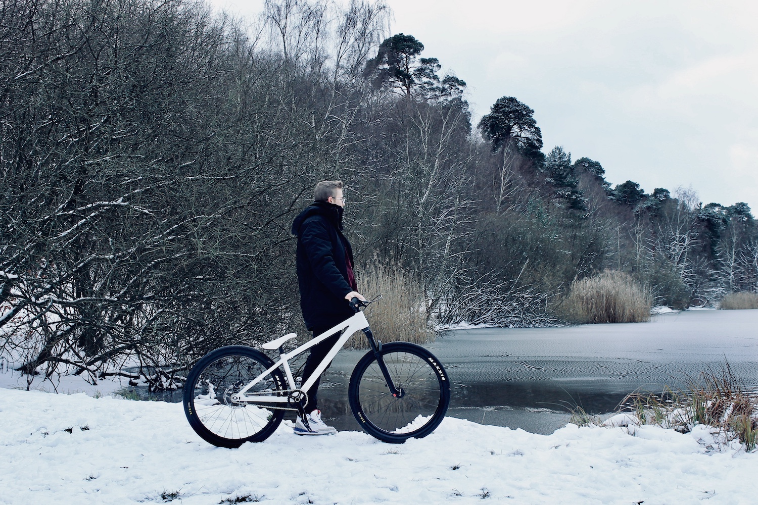 Das Gravity Stitched 360° wurde dafür im typischen OPM-Style clean und weiß gehalten und begeistert optisch nicht nur die Fahrrad-Junkies. Ohne Euch übermäßig mit technischen Details zu langweilen, können wir sagen, dass das Stitched 360° mit dem Rock Shox Pike DJ, dem Tapered Steerer und den Truvativ-Descendant-Kurbeln alles mitbringt, was man für einen ordentlichen »Slopstyle-Dirttrack« benötigt. Der bombenfeste Canyon G5 Vorbau und Lenker sorgen für beste Kontrolle und verschmerzen selbst böse Patzer. Das Gewicht des kompakten Dirt Bikes beträgt rund 11 kg (Größe L).