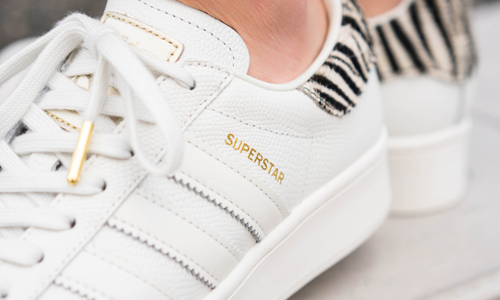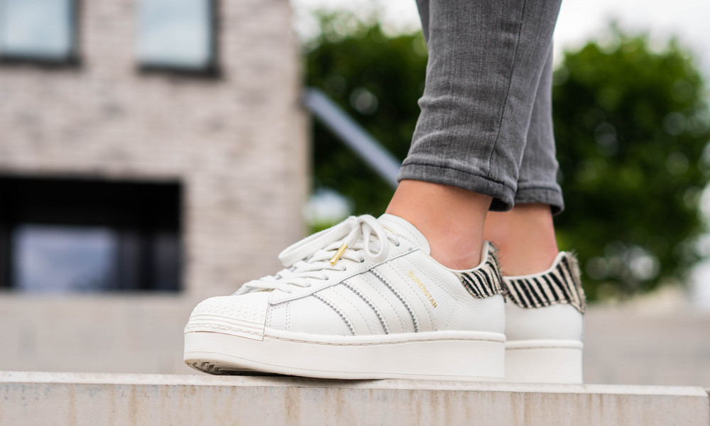 Im Hause adidas werden auch Turnschuh-Klassiker mit Plateausohle versehen. Momentan ist der adidas Superstar Bold W besonders gefragt, der mit charakteristischer Shell-Toe und wilden Colorways glänzt. Unser aktueller Liebling ist die Version im Zebra Colorway: Der Superstar kommt hier neben Plateausohle, auch mit goldenen Details daher. Eine zusätzliche Besonderheit, die den Look abrundet, ist der Fersenbereich mit Pony Hair im Animalprint.