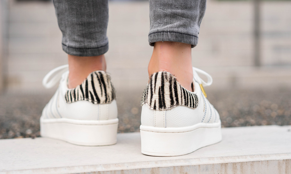 Im Hause adidas werden auch Turnschuh-Klassiker mit Plateausohle versehen. Momentan ist der adidas Superstar Bold W besonders gefragt, der mit charakteristischer Shell-Toe und wilden Colorways glänzt. Unser aktueller Liebling ist die Version im Zebra Colorway: Der Superstar kommt hier neben Plateausohle, auch mit goldenen Details daher. Eine zusätzliche Besonderheit, die den Look abrundet, ist der Fersenbereich mit Pony Hair im Animalprint.