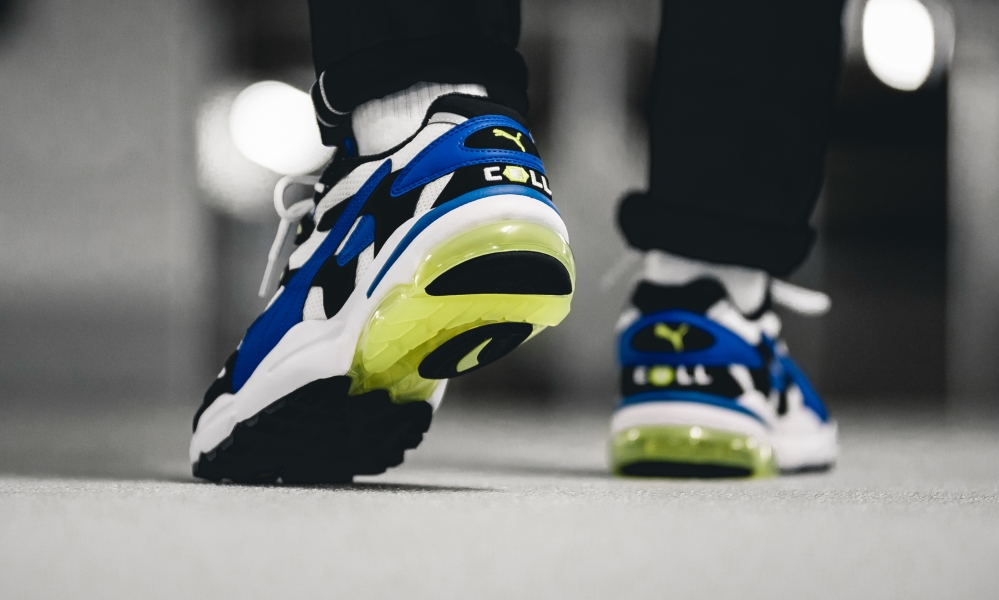 Nach dem Comeback von Puma CELL in den letzten Monaten ist es nun der CELL Alien OG, der uns aus Herzogenaurach zurückgebracht wird. Ursprünglich 1998 releast, sieht man auch ihm die Designsprache der späten 90er und frühen 00er Jahre klar an. “Klotzen statt Kleckern” war angesagt, Technologie sollte jederzeit nach außen hin sichtbar sein. Und das kommt auch heute wieder gut an! Vom bereits releasten Cell Venom unterscheidet sich der Alien OG zunächst mit seiner durchgehenden Sohle, dazu ist die Form weitaus dynamischer und das Muster auf dem Upper detaillierter. Besonders auffällig sind schwarzen “Pfeilspitzen”, die entgegen der Richtung des Puma Form Stripes verlaufen. Farblich nutzte Puma auch beim Cell Alien OG die schon bekannten CELL-Farben, die auch hier wieder ein lautes Design erreichen. Neben schwarz, weiß und blau ist es vor allem das Neongelb, das auffällt und den Schuh knallig macht.