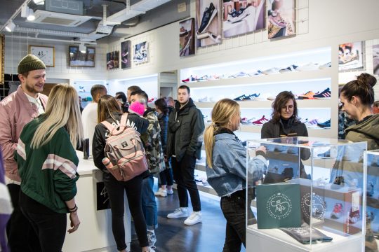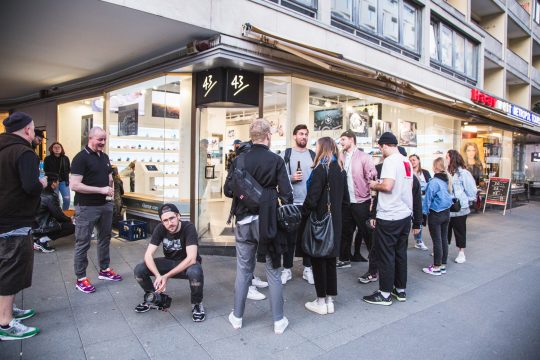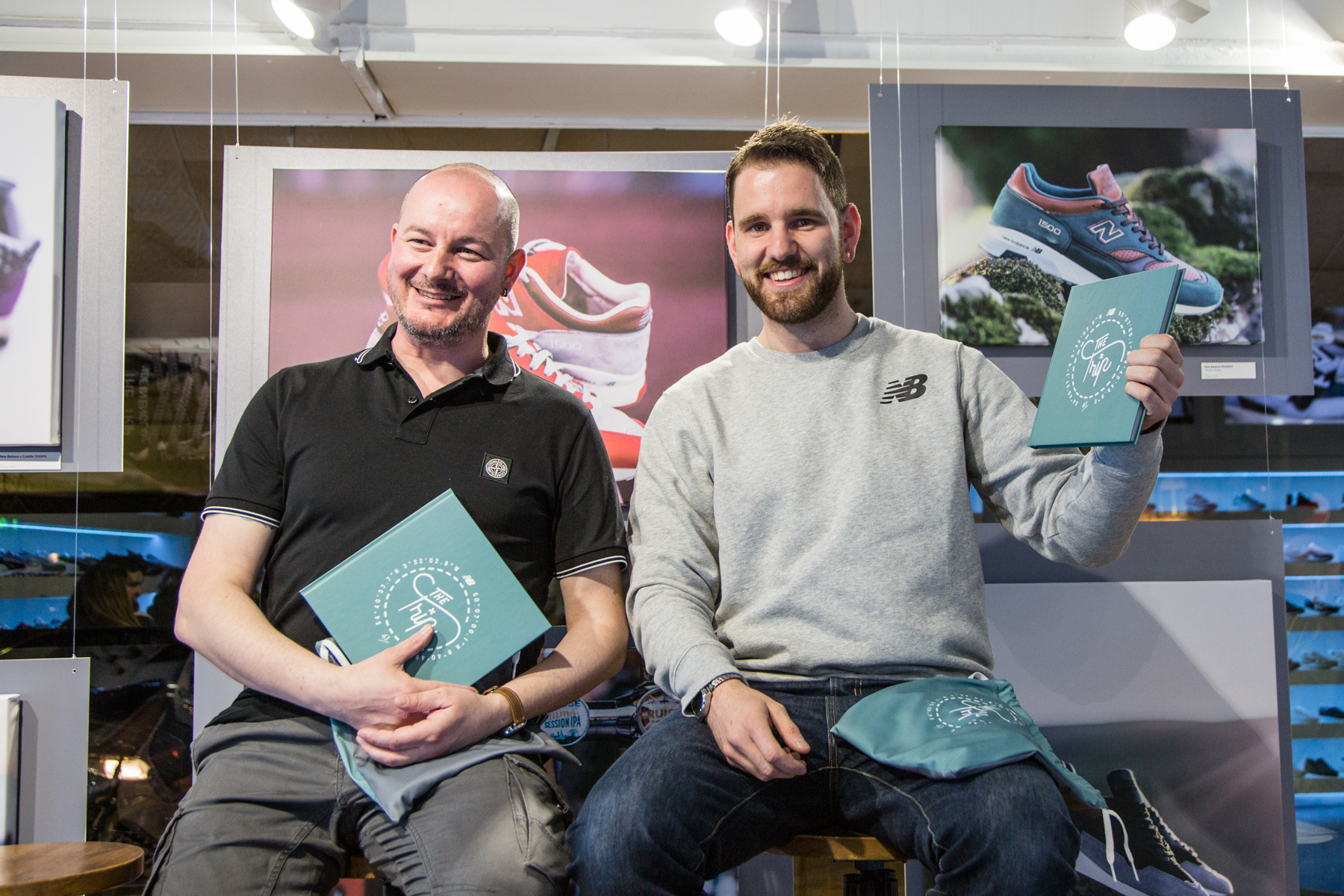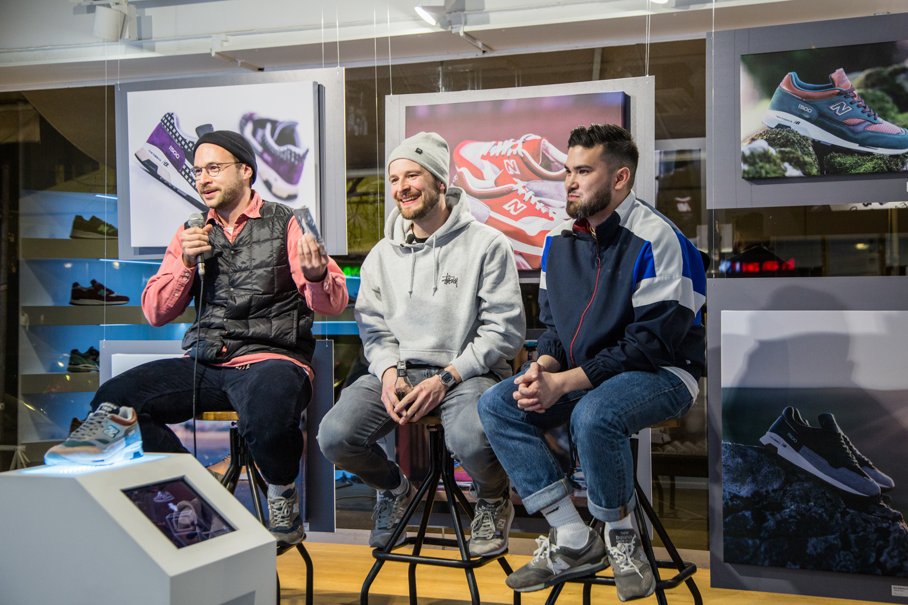 Highlight des Abends und Hauptgrund zu Feiern war natürlich der New Balance M150043EH »THE TRIP«, von dem lediglich 6 Paar in Flimby nach unseren Vorstellungen hergestellt wurden. Mit seiner Special Box und dem Packaging mit Photo-Book, Shoe-Bags und dem eigens angefertigten Kompass macht der schon richtig viel her! Ein Paar wurde beim Event verlost, ein weiteres gibt es aktuell noch online zu gewinnen – etwas Zeit ist noch! Vor der Verlosung standen Olli, Gründer von 43einhalb und verantwortlich für’s gelungene Design sowie Franky von New Balance bei einem kleinen Panel Talk Rede und Antwort zum Projekt.