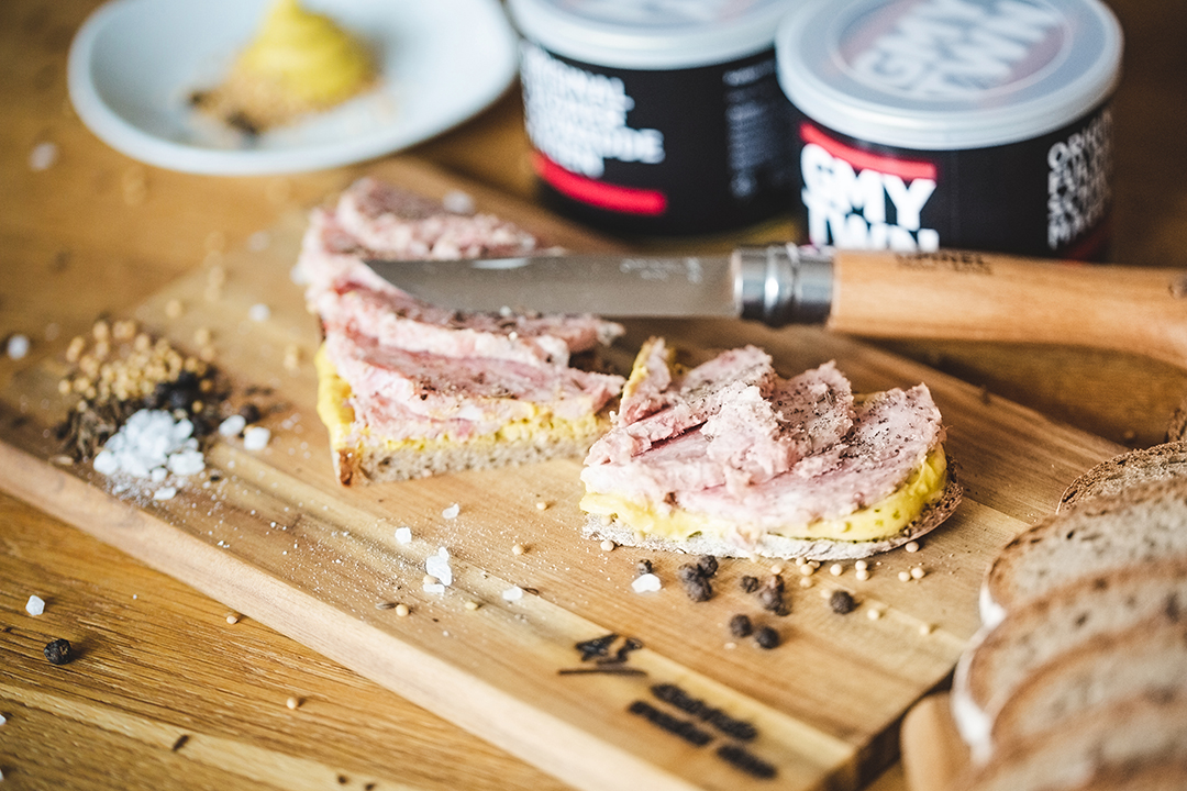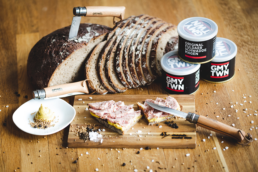 Extra für die Sneakerness haben wir auch noch ein kleines Vesper-Set entwickelt. Wir nennen es liebevoll unseren »Fuldaer Rucksack« – bestehend aus unserem leckeren Schwaddemagen, einem Opinel-Messer und einem Frühstücksbrettchen, das wir 43einhalber sogar selbst mit viel Liebe gebrandet haben: