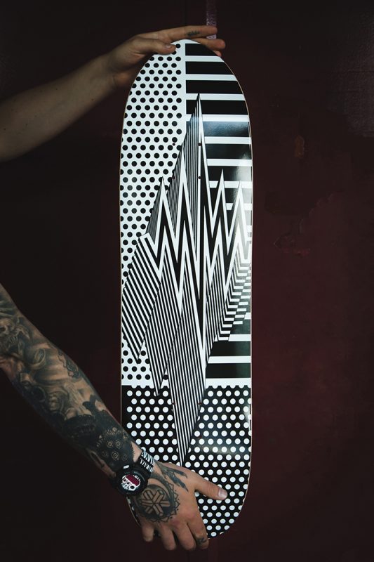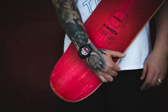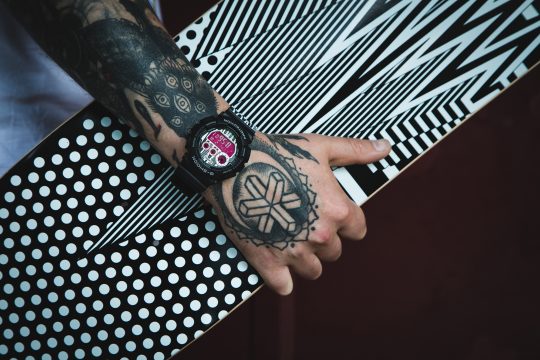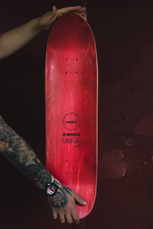 Thomas Marecki alias Marok ist Künstler, Skateboarder, Grafikdesigner und Herausgeber des »Lodown Magazin«. Zusammen mit G-Shock designte er dieses Frühjahr ein Skate Deck mit heftigem 90er Flair, der durch das Zusammenspiel eines wilden Schwarz-Weiß-Musters auf der Rückseite und einer Bubble-Gum roten Oberseite zustande kommt.